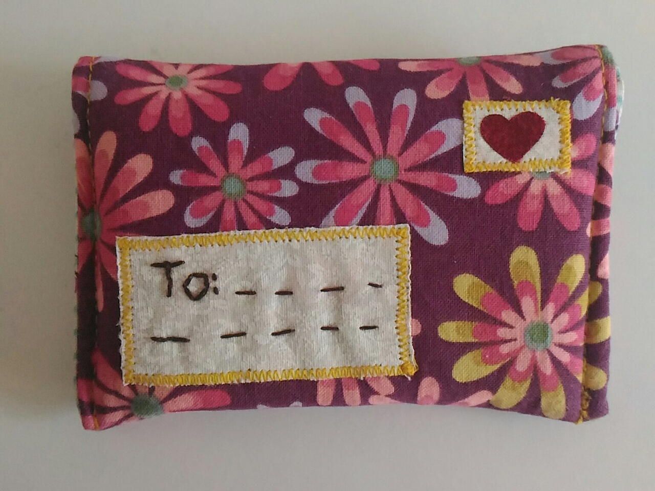 Put the fabrics with the right side together + batting. Leave 4cm opened to turn the envelope to the right side. Cut the 5 edges