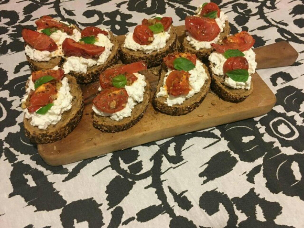 Препечените филийки се натъкват със скилидки чесън, капва се зехтин, мажат се с малко от доматената паста, след това със сместа от моцарела и извара, поръсва се с листенца босилек, няколко нарязани на половина, запечени чери доматчета.