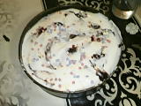 Накрая добавяме сладкото от боровинки отгоре и отново оставяме в хладилника. Добре е да престои поне 3 часа преди ядене.