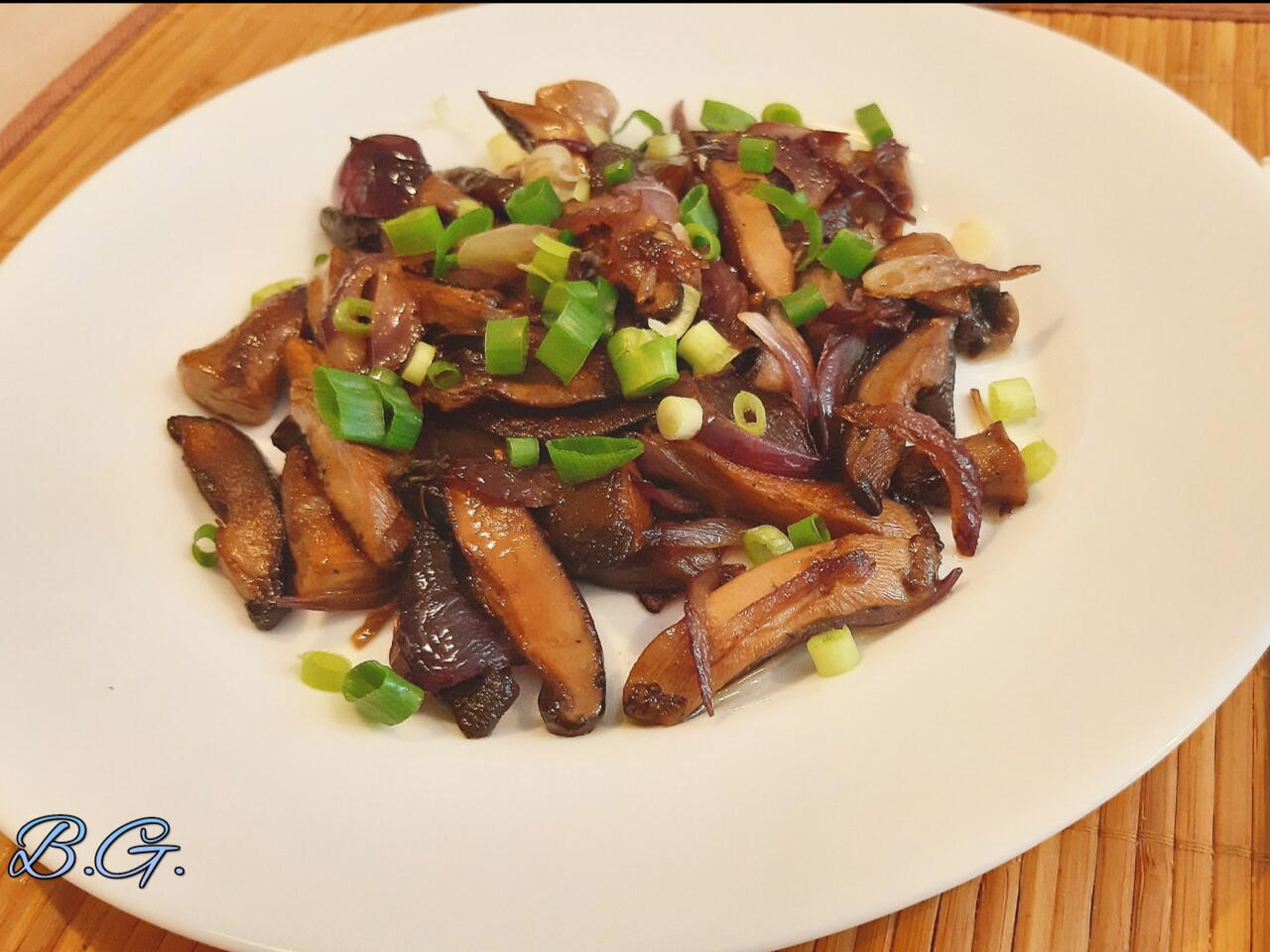 Като се задушат и омекнат добавяме нарязания червен лук и чесъна, малко сол и черен пипер. Това съчетание бе по моя идея, оригиналната рецепта е само със сол, но се получи вкусно. След готовност запържваме още малко до златисто и сервираме в чиния с поръсен нарязан зелен лук отгоре. И това е! 🙂