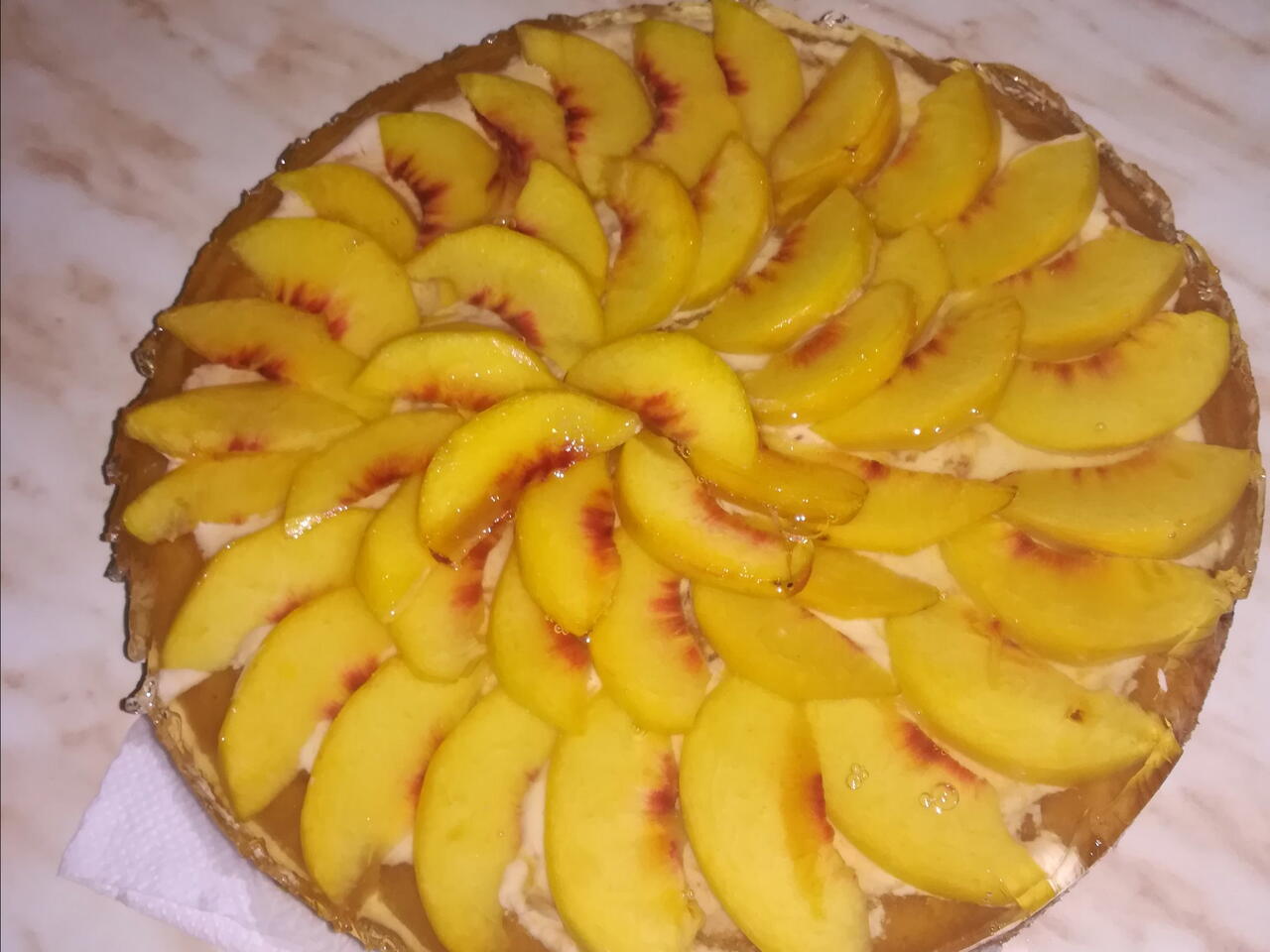 Редете тортата във форма за торта. Като си оставите малко крем за горния блат(колкото да залепите нарязаните на филийки праскови ). Направете захарни сироп, като по изстине добавете в него желатин. Залрйте всичко о оставете тортата за няколко часа в хладилника да стегне.