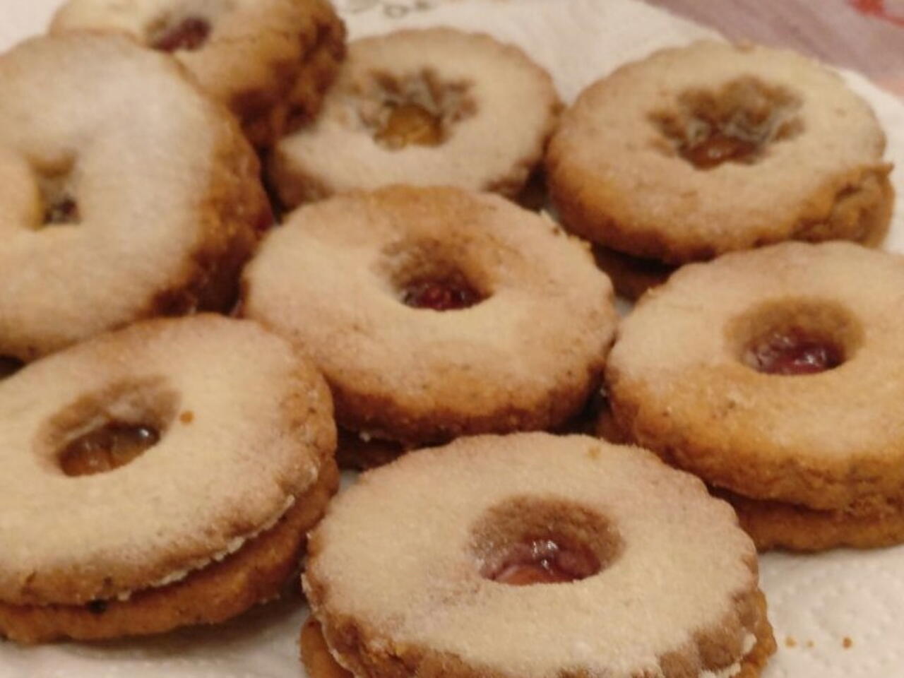 След като изстинат, бисквитките с дупка се поръсват с пудра захар, а основата се намазва с конфитюр по избор. Слепват се внимателно, защото са много крехки.