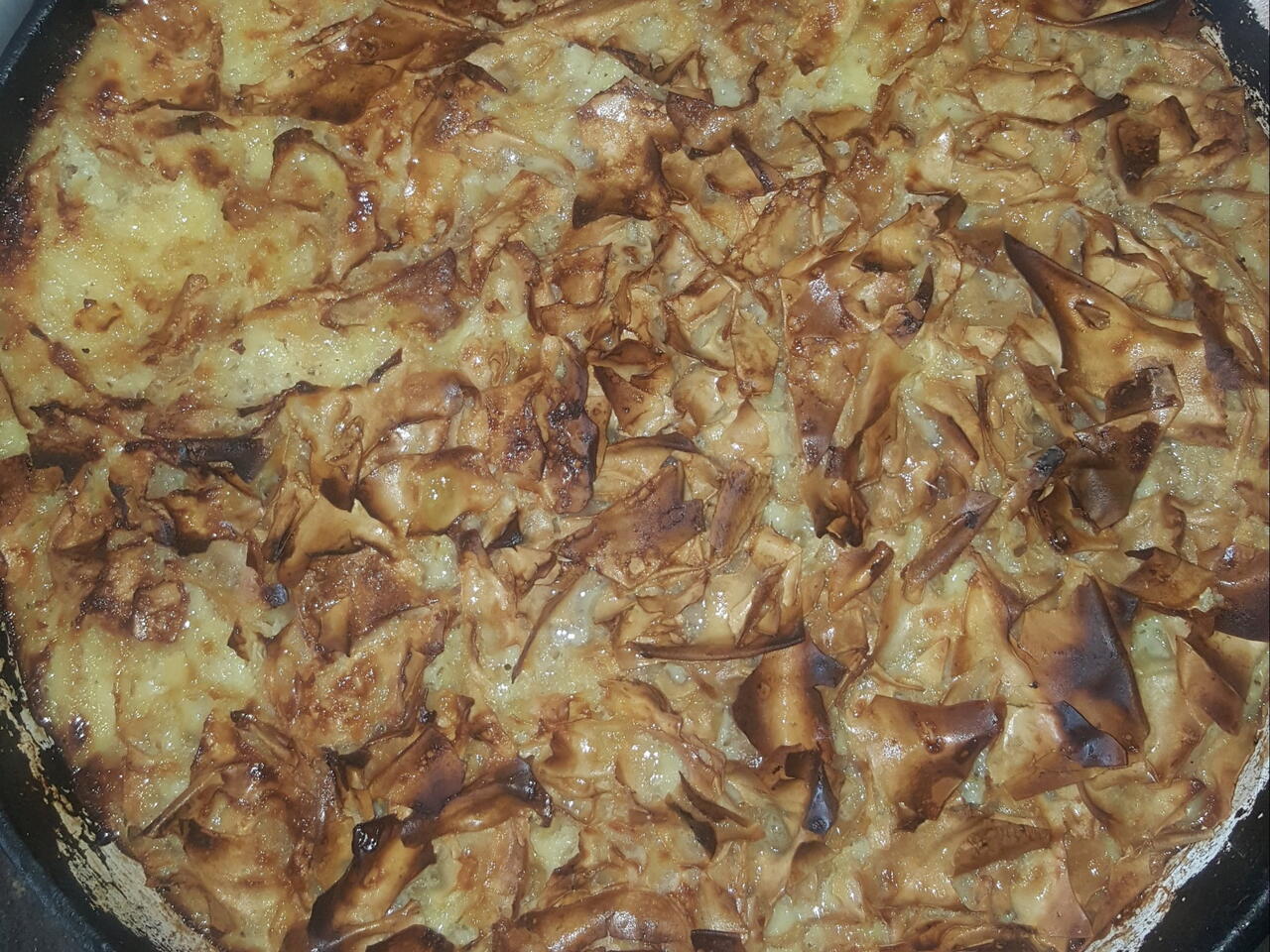 Сипете домашната юфка в подмазнена тава и я разстелете, след което отгоре равномерно разпределете маслото.Сложете да се запече във фурната, докато маслото се разтопи и юфката леко се зачерви.Разбийте яйцата със захарта, млякото и ванилията. Залейте запечената юфка с тази смес.Сложете да се пече на умерена температура за около 20-30 минути.Изпечената Млечна баница