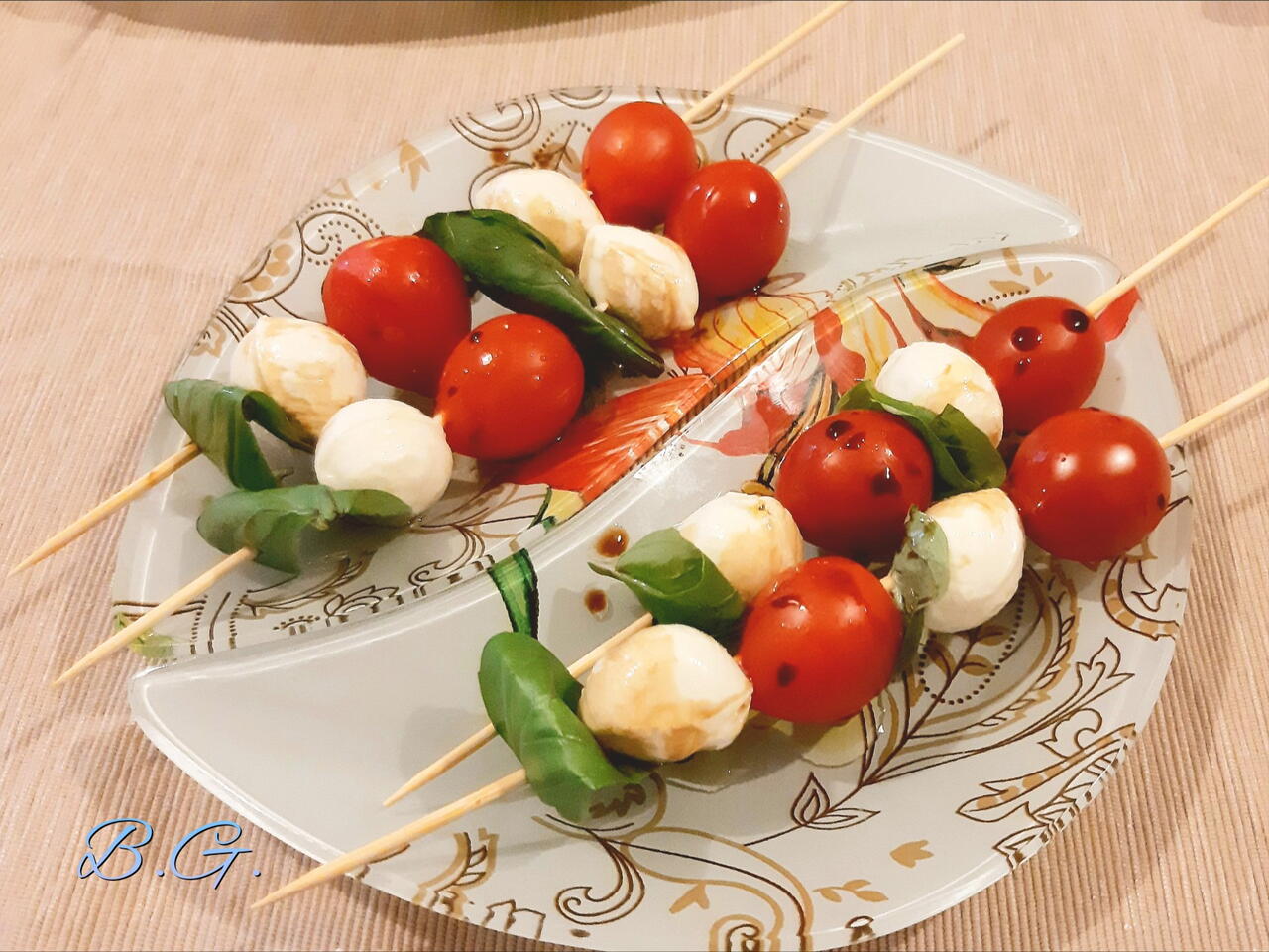 Подредете на шиша редувайки чери доматче, моцарела и босилек. Готовите шишчета поръсете с малко зехтин и балсамико. Поднесете с хубаво питие 🥂