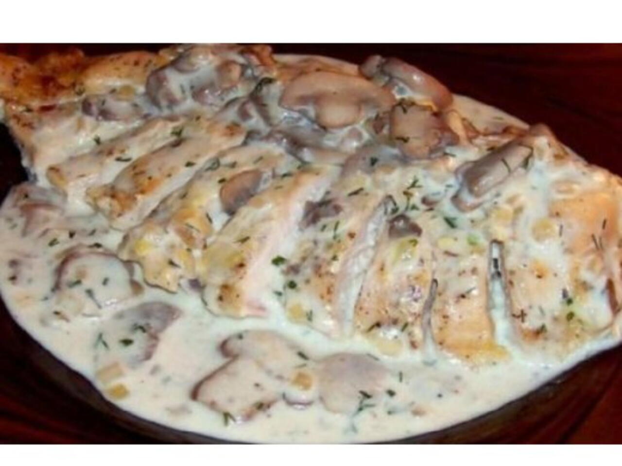 Пилето с гъби в заквасена сметана е готово. Идеално допълнение към това ястие ще бъдат тестени изделия, варен ориз или картофи.
