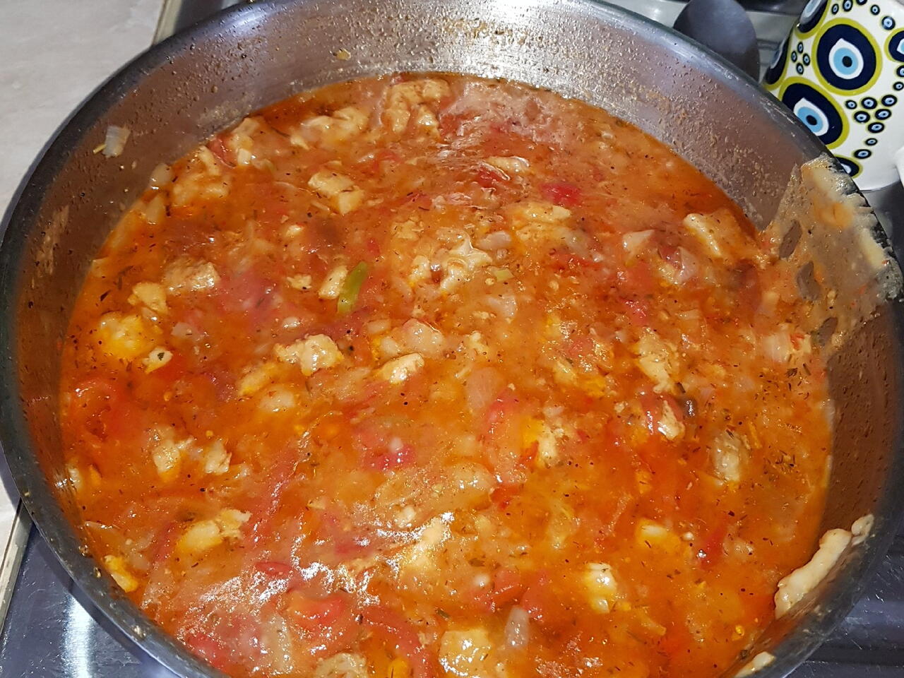 Naryazvame Luka fobavame pecenite piper i dobavame izpriskite sol na fkus ceren piper .dobavame domatiniya soz .iza zastroika 2 lajici brasno s mako voda se dobaviya .