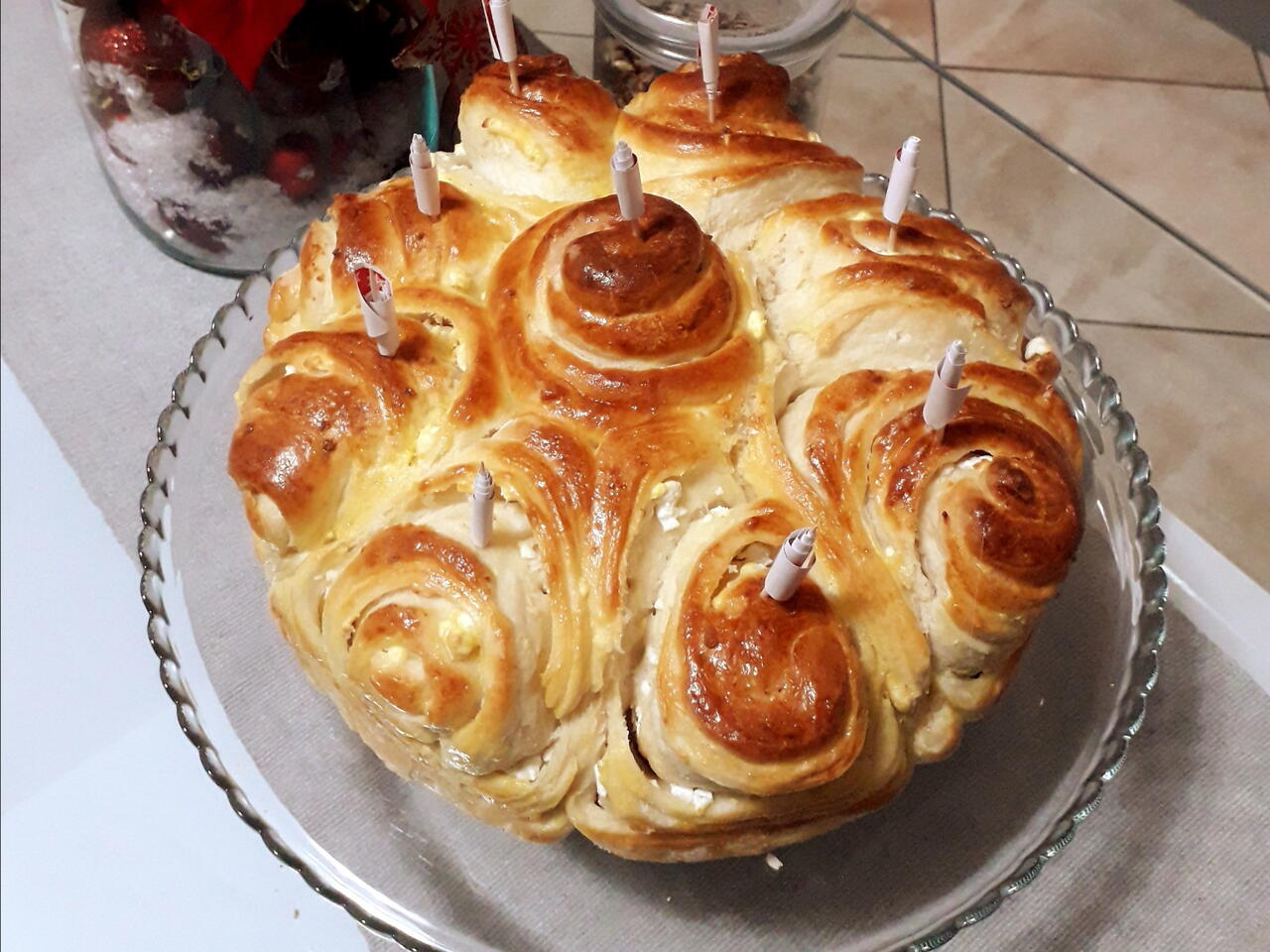 Всички съставки се смесват и се омесва тесто. Оставя се за около един час за да втаса, като се завива.След като е готово се разделя на две топчета и се разточват с еднаква големина.