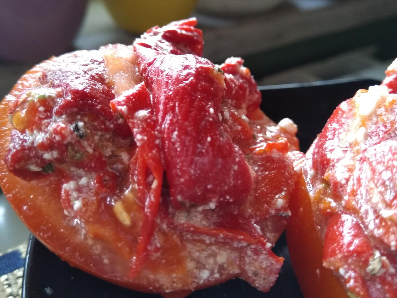 Първо нарязваме капиите на ивички, след което ги смесваме с изварата, зехтина, солта и подправките. Изрязване домата на две половини,издълбаваме го. Издълбаното съдържание смесваме със сместа на капията. След, което пълним доматите. Да Ви е сладко!