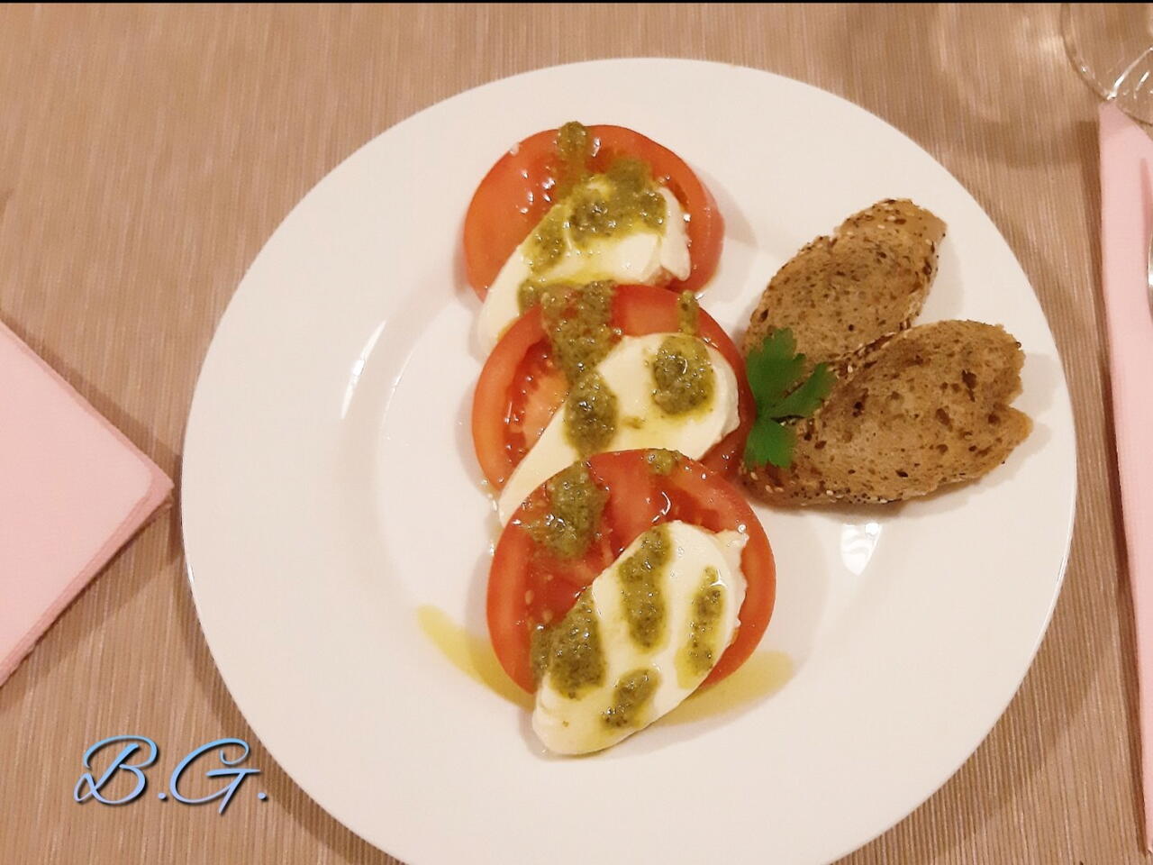 Нарежете на тънки слайсове доматите и моцарелата. В чиния наредете парче домат и отгоре парче моцарела (аз посолявам всяко по отделно), а след това нанесете домашно или готово босилеково песто (това на Barilla ми допада). Накрая полейте леко със зехтин (някои си добавят и балсамико - според личния вкус). Можете да добавите прясно стръкче босилек или зелена подправка за украса, в случая има и прясно изпечени брускети на фурна със зехтин - "плейтвайте" според Вашата визия 🙂🥂