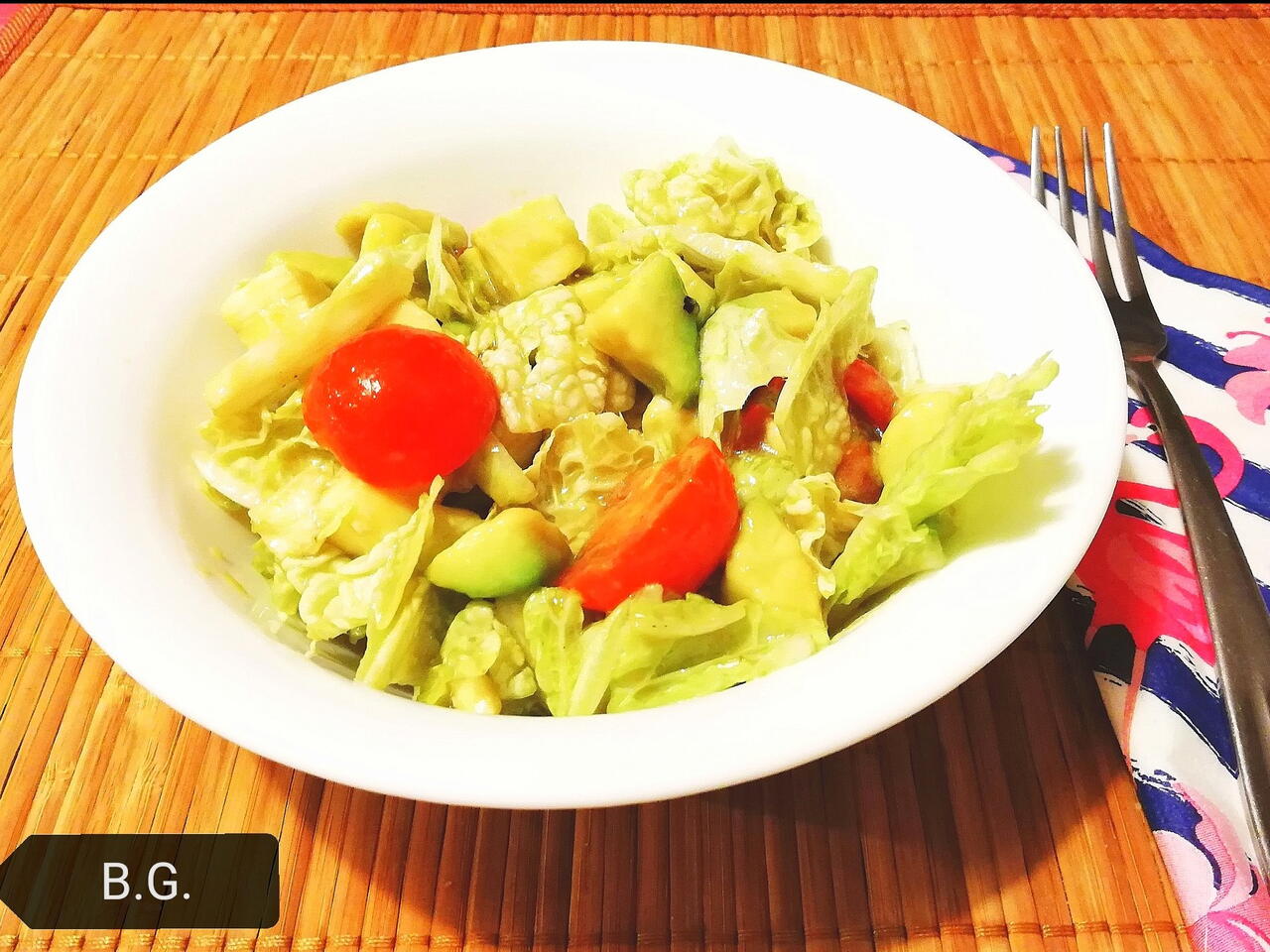 Нарежете китайското зеле /или айсберг/ на квадратчета. Добавете моцарелата също на малки парченца. Авокадото се разполовява с нож и след това със супена лъжица се издълбава сърцевината от кората. Добавете в купата и чери доматчетата на половинки.