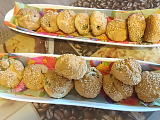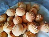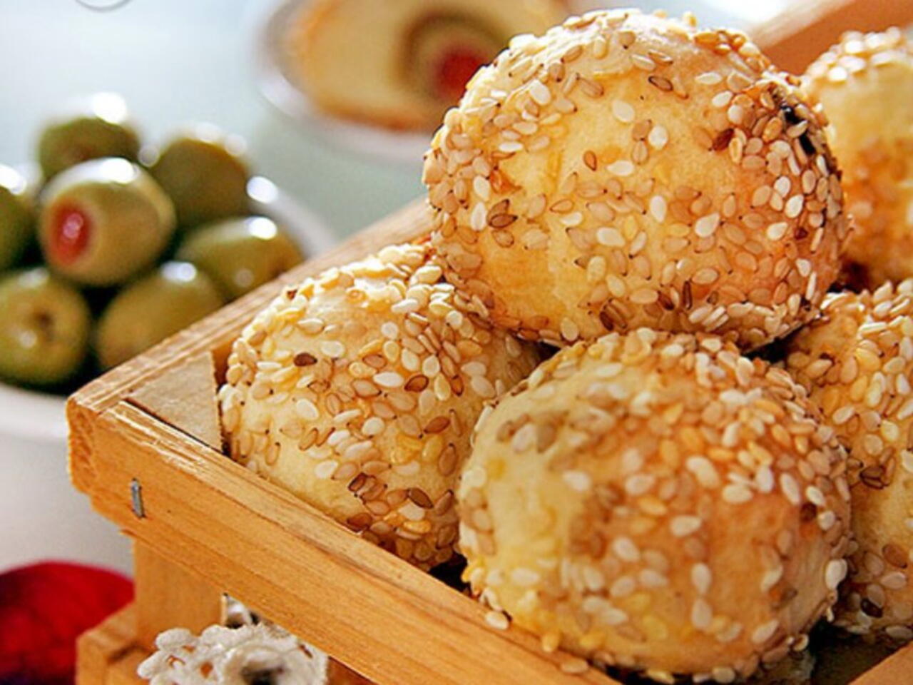 От тестото направете топчета с големина на малък орех. В средата на всяко сложете по една маслина. Оваляйте топчетата в сусам и ги подредете в тава, покрита с хартия за печене.
