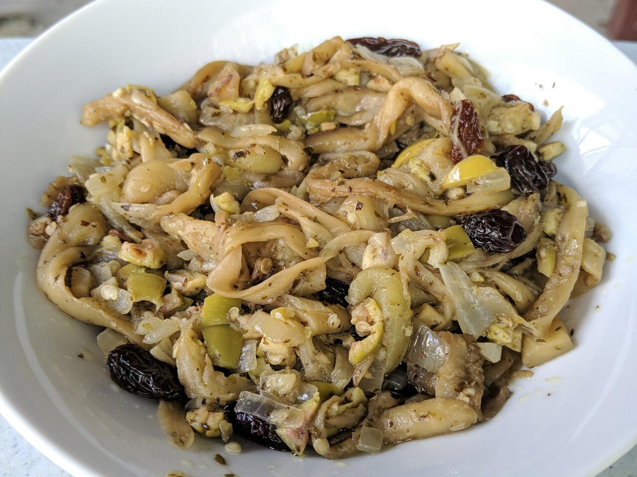 Acrescente as azeitonas picadas, as uvas passas, pimenta, ( opcional ) acerte o sal e regue com um boml azeite de oliva.