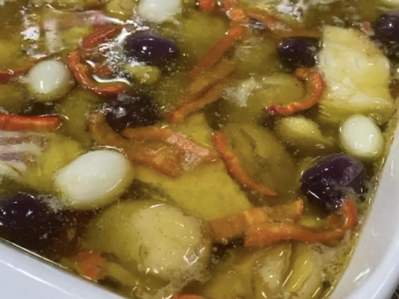 Arrume da seguinte forma: no tabuleiro onde já estão as batatinhas e o azeite vá alternando o bacalhau, as cebolinhas, o alho, o pimentão vermelho, as azeitonas pretas, as folhas de louro, a pimenta branca e o vinagre.