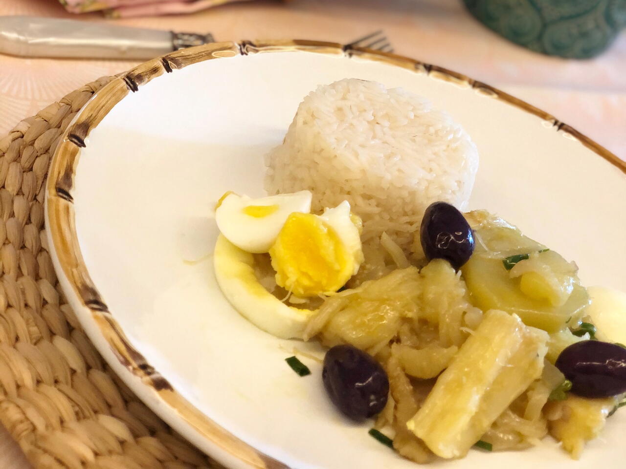 Cozinhe as batatas cortadas em rodelas. Retire do fogo, escorra-as bem e em seguida, frite-as em óleo quente. Reserve. Corte as cebolas em rodelas finas e doure-as em uma frigideira com um pouco de azeite. Acrescente o bacalhau, as batatas e as azeitonas. Em seguida, regue com azeite e misture bem. Para finalizar, sirva o prato com os ovos cozidos cortados em quatro partes com salsinha salpicada por cima.
