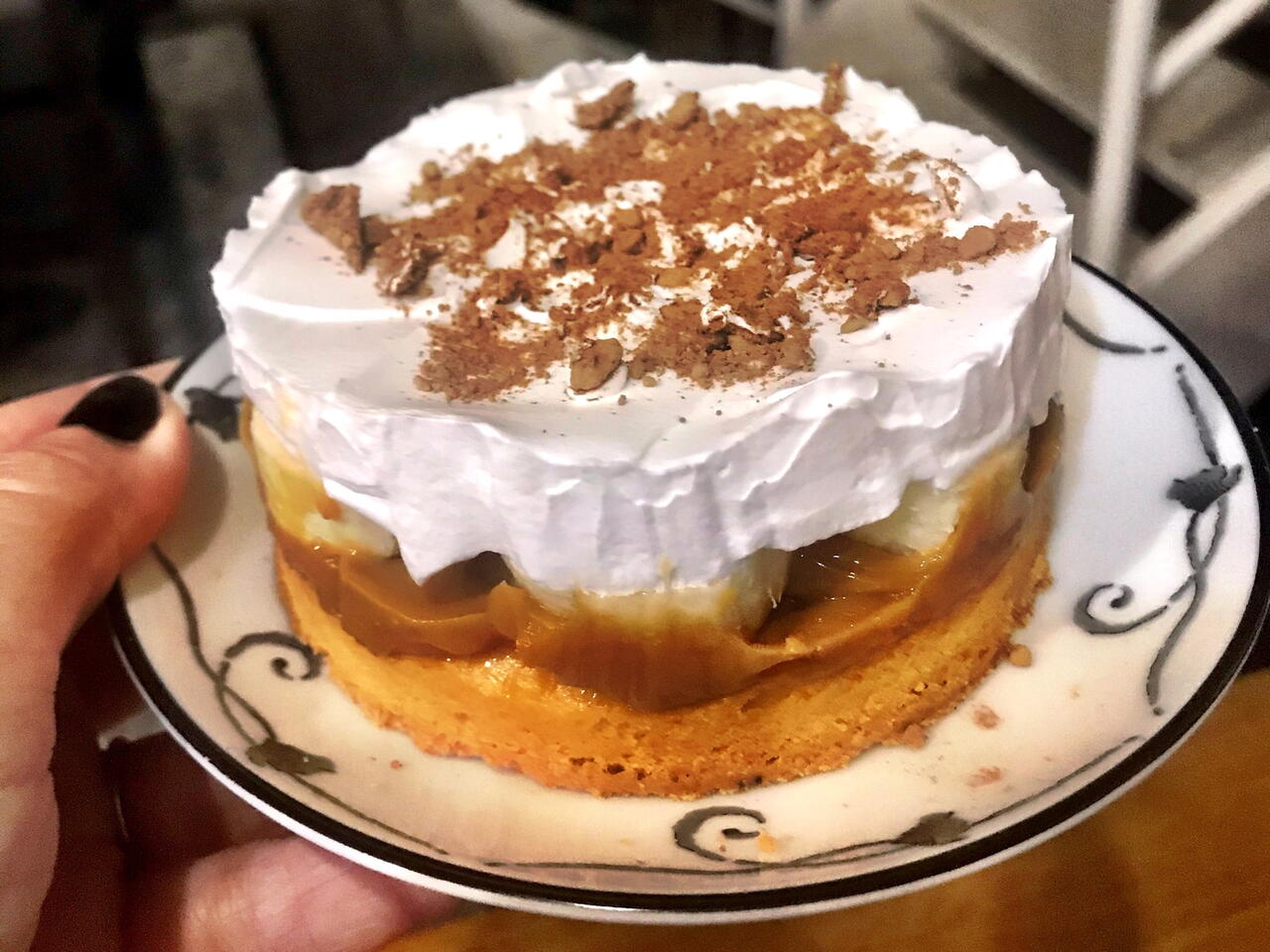 Sem desinformar a massa , passe uma camada generosa de doce de leite , coloque as bananas e cubra com o chantilly , polvilhe chocolate e desinforme no prato de sua preferência.