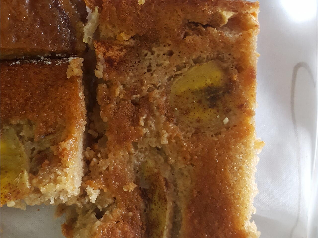 Em uma forma untada despeje metade da massa, acrescente as bananas e maçã picadas. Coloque o restante da massa e polvilhe canela a gosto.