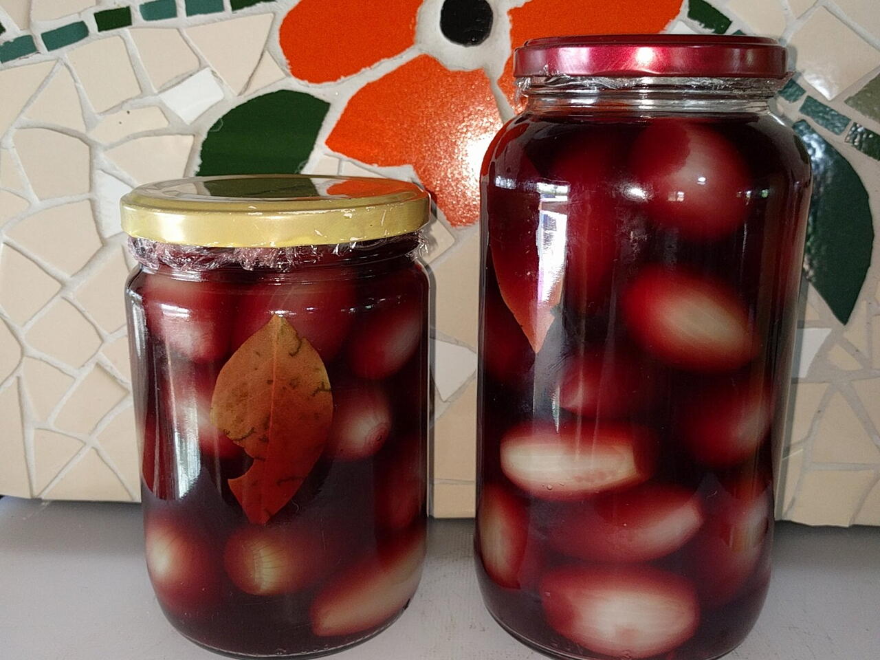 Coloque os recepientes e as tampas para ferver. depois de tudo frio coloque as cebolas no vidro, a água fria, as folhas de louro