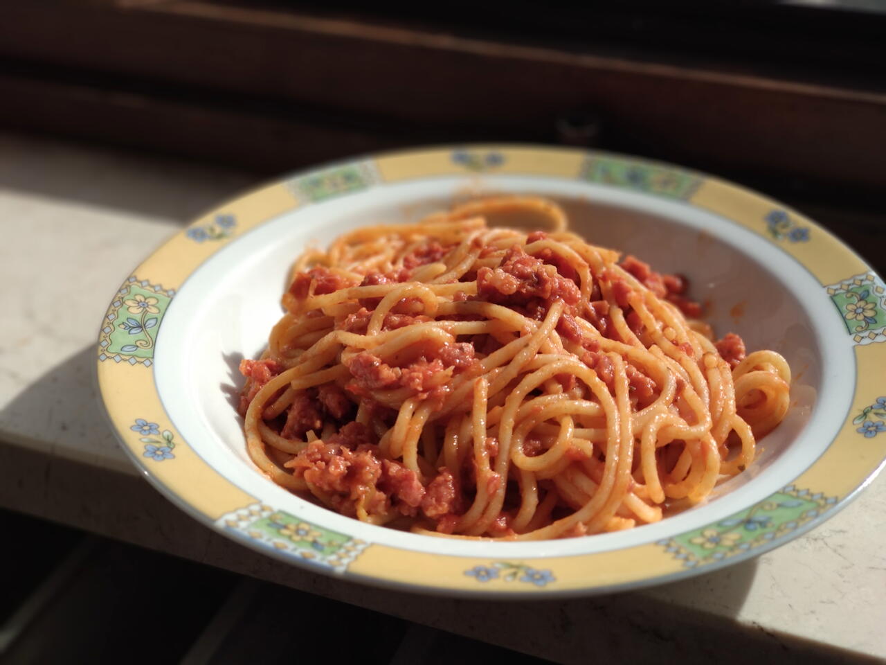 Adicione o spaghetti junto ao molho em fogo baixo e mexa bem, assim que estiver bem uniforme sirva.