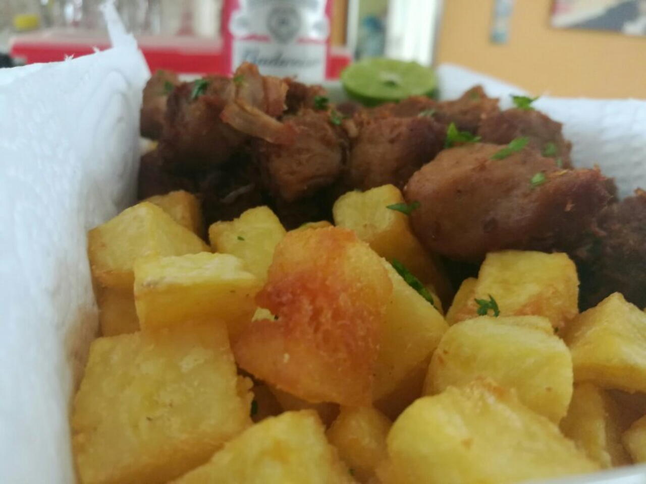 Cozinhar as batatas em cubos por uns 5 minutos ou até elas ficarem um pouco macias,eu adicionei um caldo de carne na água para dar sabor,em seguida escojer a água e fritar em óleo em imersão, e pronto salpicar salsinha em cima da carne com as batatas