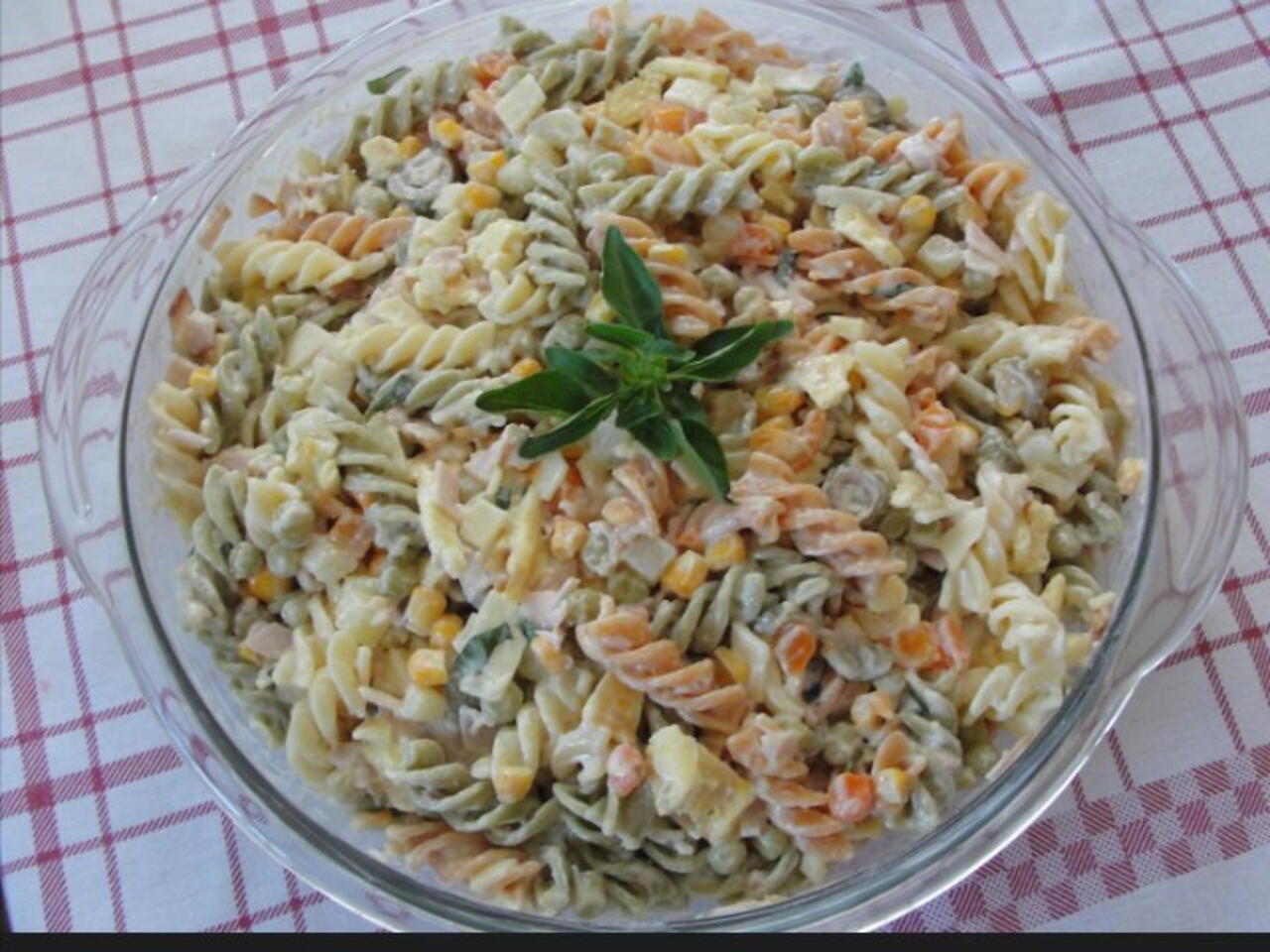Cozinhe o macarrão ( não deixe muito cozido) com água sal, oleo e vinagre. Em seguida prepara os temperos. Corte o tomate sem pele, sem semente, corta a cebola, cebolinha verde. Após feito isso escorra o macarrão e mistura os temperos cortados e milho. Para finalizar tempere com limão e maionese