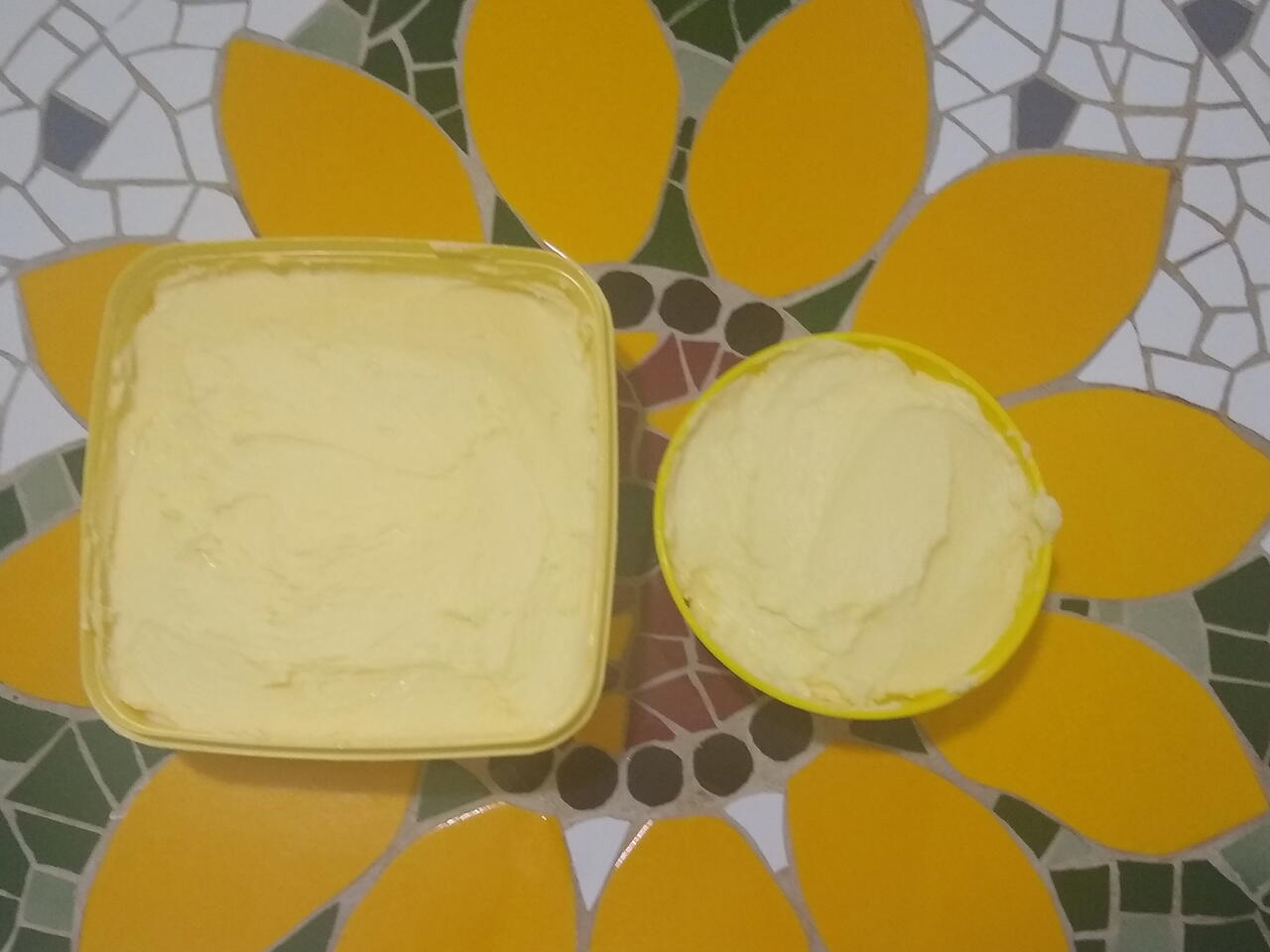 Um pote com 2 litros de nata rendeu cerca de 1,2 litros de manteiga. A nata é de leite fervido.