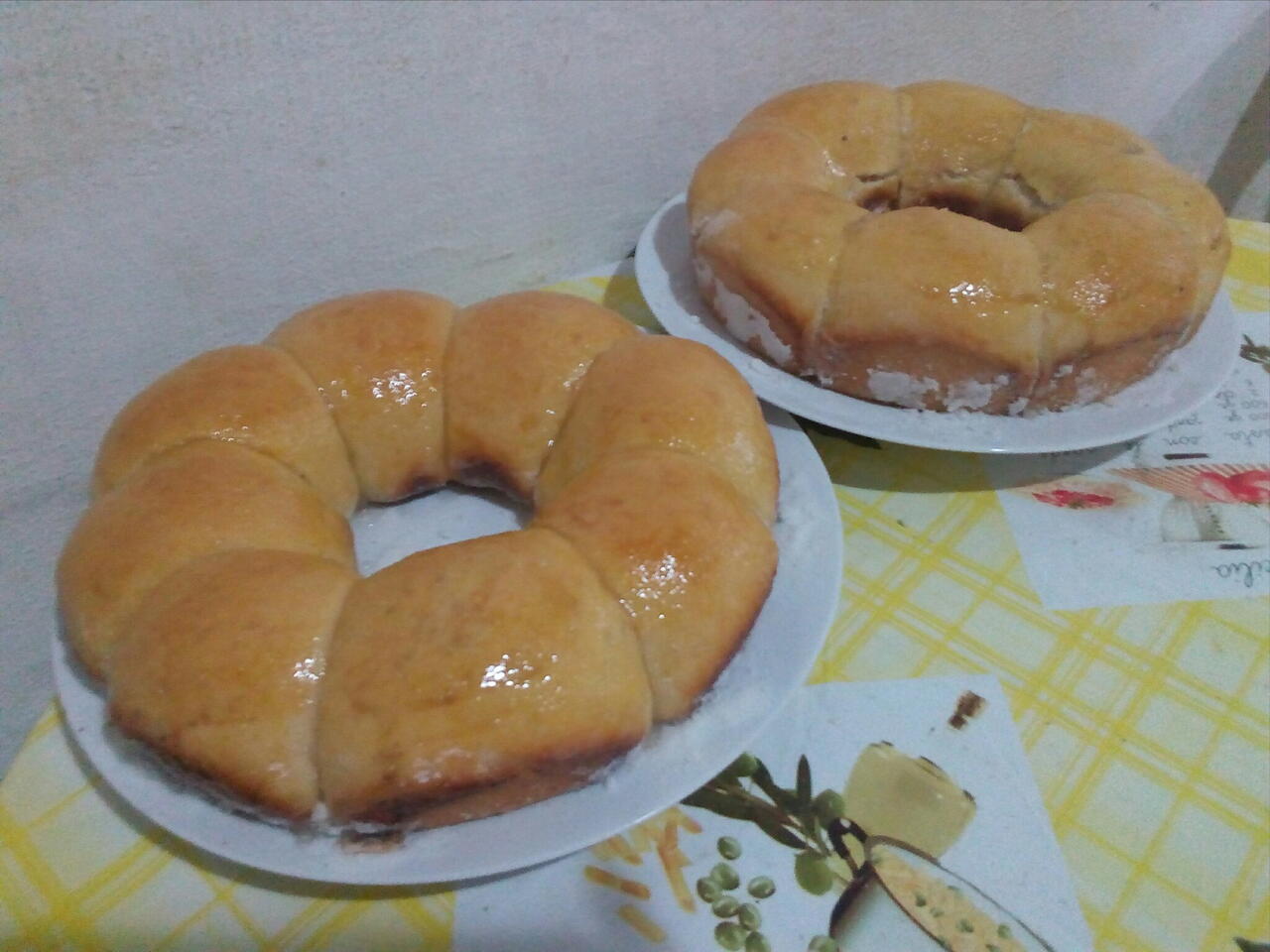 Obs a minha massa rendeu duas formas grandes e uma pequena.mas rende três formas médias.(dica quando tirei do forno pincelei com uma caldinha de água e açúcar,eu coloquei duas colheres de açúcar em uma panela e uma colher de água deixei o açúcar derreter depois pincelei em cima dos pães. Ficou muito bom. Espero q vcs testem e me digam o que acharam aqui em casa todo mundo amou..😍😍😍