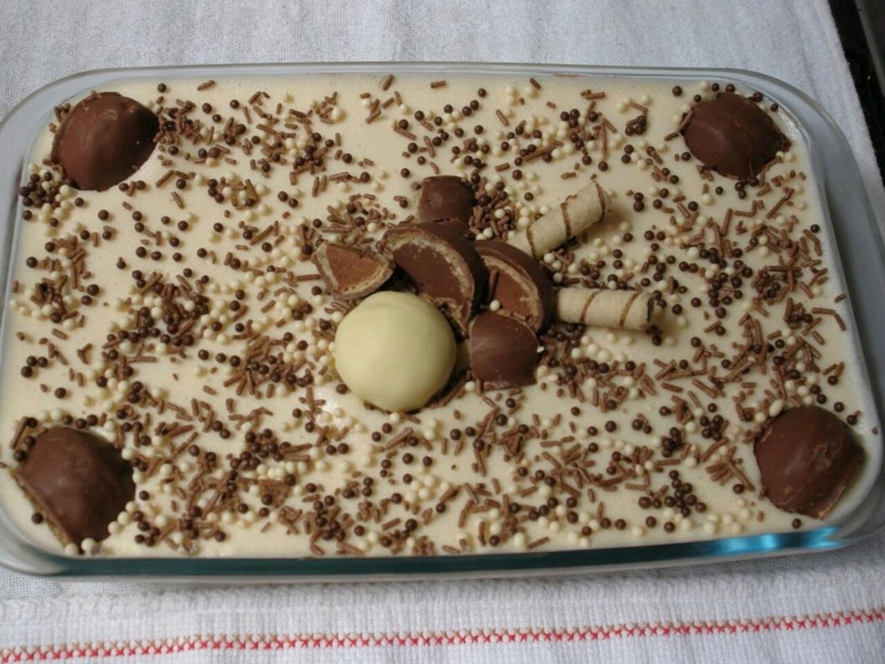 Fazer o chantilly de acordo com as especificações da embalagem. Espalhe em cima do chocolate derretido na Travessa e em seguida salpicar com o chocolate granulado. Enfeitar com os 05 bombons inteiros que sobraram.