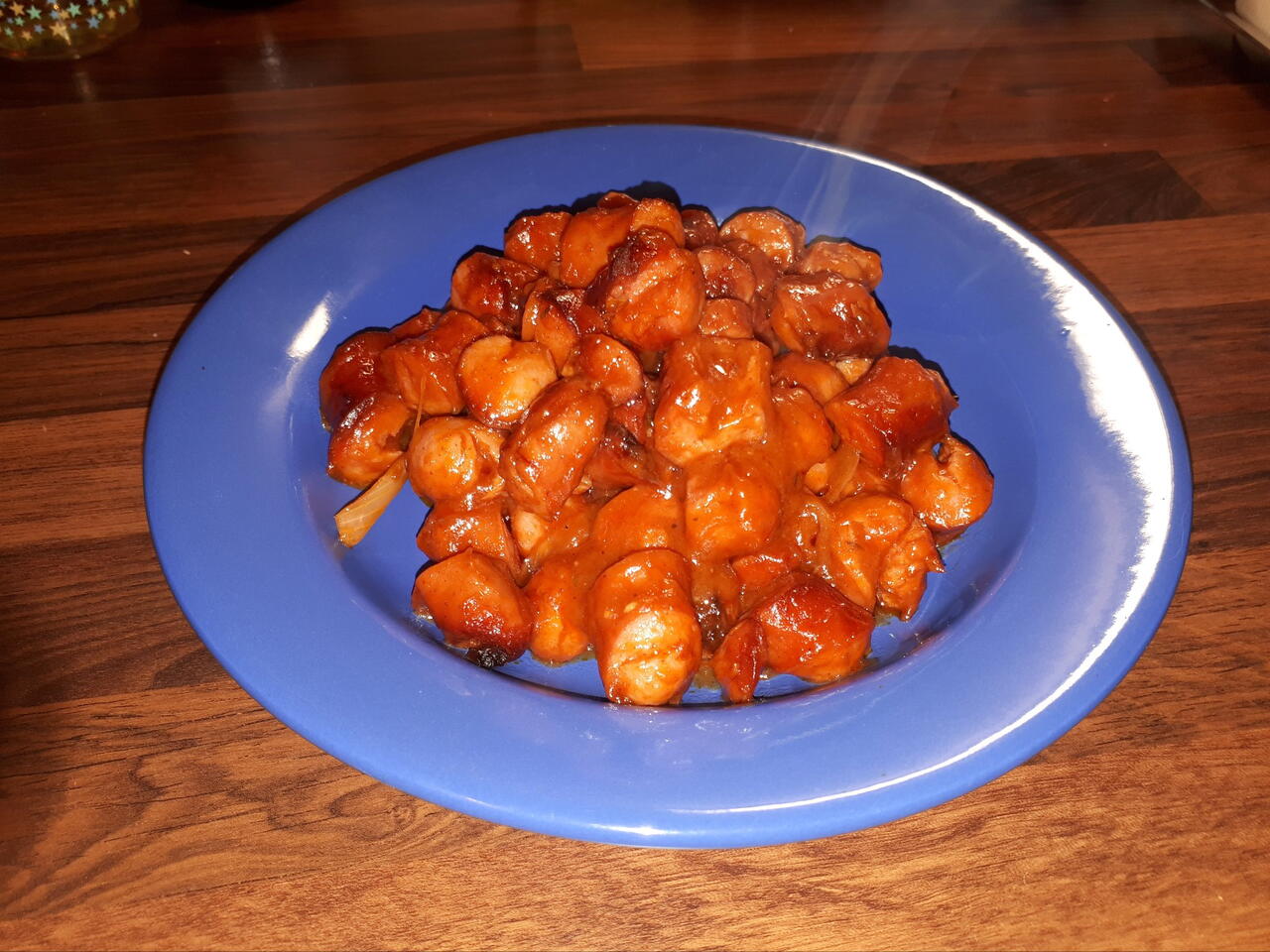Buřty oloupeme, nakrájíme na kolečka a uložíme na sádlem vymazaný pekáč, přidáme cibuli nakrájenou na půlměsíčky. Přidáme zbytek ingrediencí dle měrky : Přiměřeně od oka 😎 a zamícháme.Pečeme cca 30minut při 180°CDobrou chuť 😉