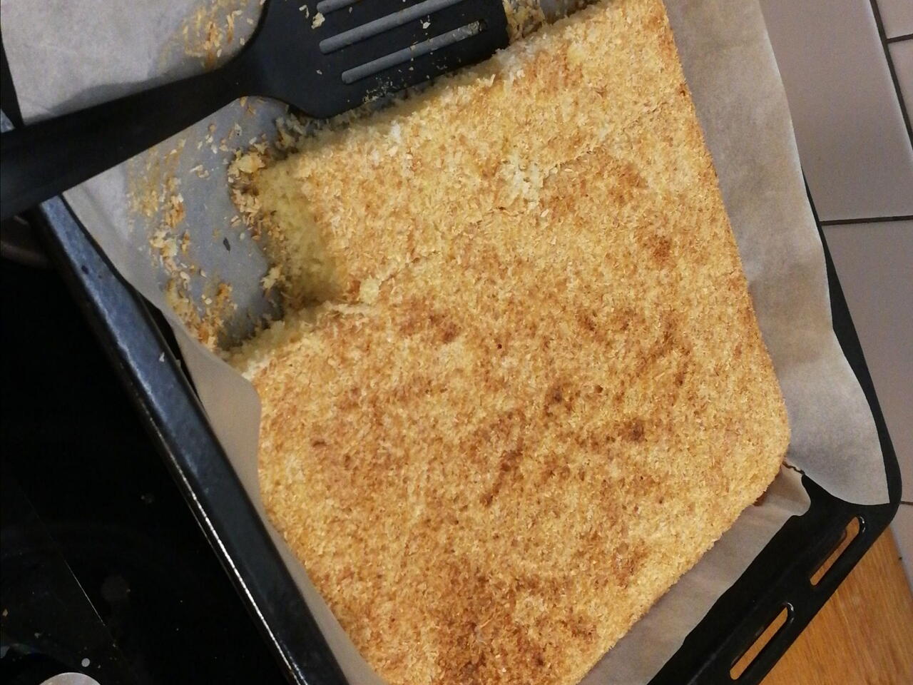 Vyleje na pecici papir a posypeme pul hrnkem kokosu navrch. Peceme 15-20min na 170°.