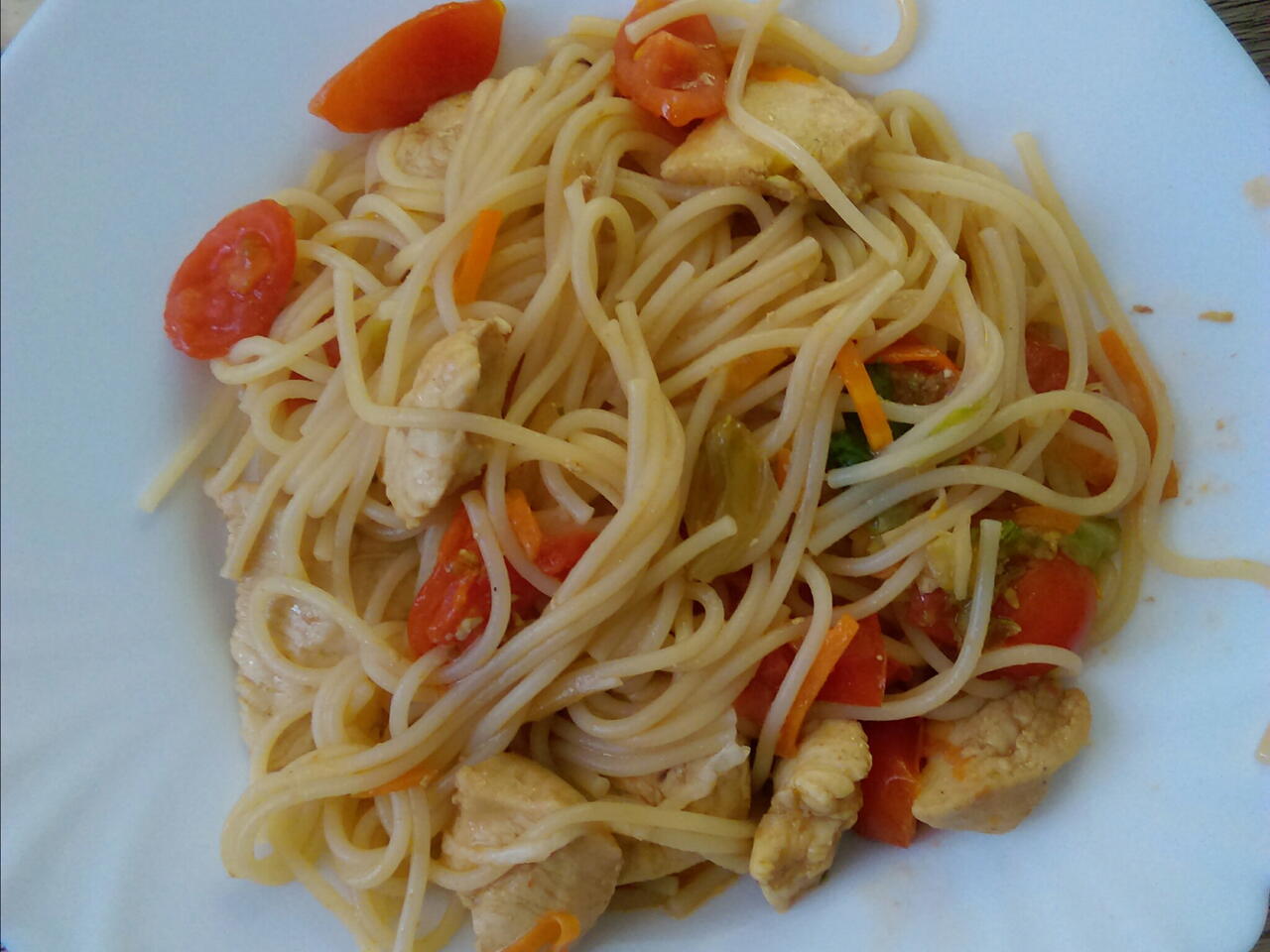 Osmahneme si maso na oleji, potom přidáme nakrájené rajské a směs salátů. Ochutíme kořením na čínu a sojovou omáčkou.