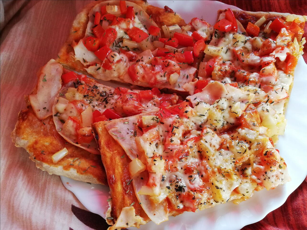 Těsto rozložíme na plech na pečící papír. Rozmačkáme ho do všech stran, aby vzniklo tenké těsto. Potřeme kečupovou omáčkou, posypeme kořením na pizzu a rozložíme zaleninovou směs.