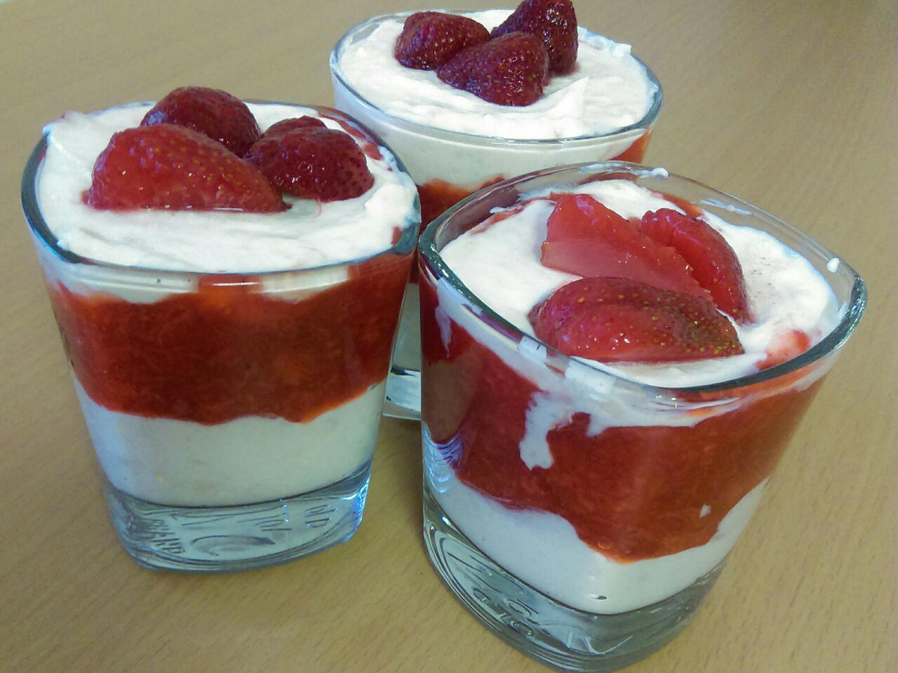 Smícháme smetanu s tvarohem. Na dno sklenic dáme smetanu na to jahodovou dřeň, znovu smetanu a ozdobíme jahodami.