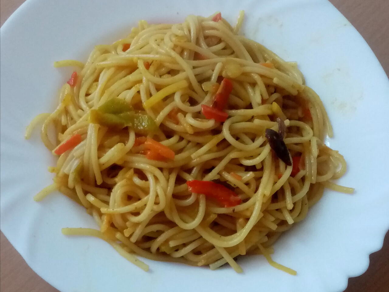 Na čisté pánvi zprudka osmahneme uvařené špagety a poté přidáme zeleninouvou směs a promícháme.