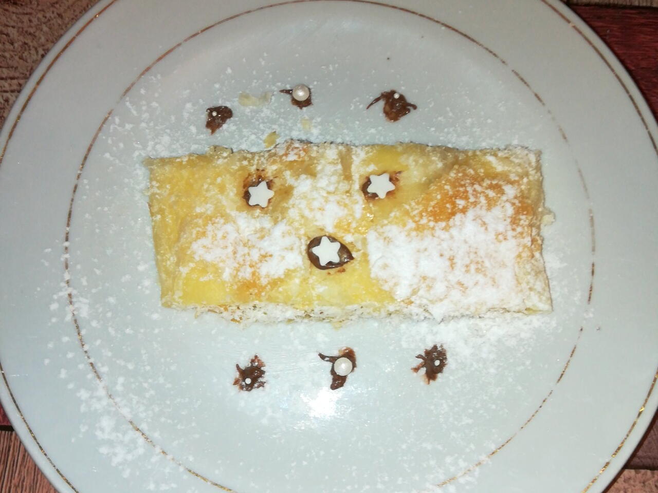 Smícháme tvaroh s vanilkovým cukrem a přidáme půlku vanilkového pudinku, rozinky. Zamícháme a kydneme na rozložené listové těsto. Zabalíme. Pomažeme rozšlehané vajíčko.