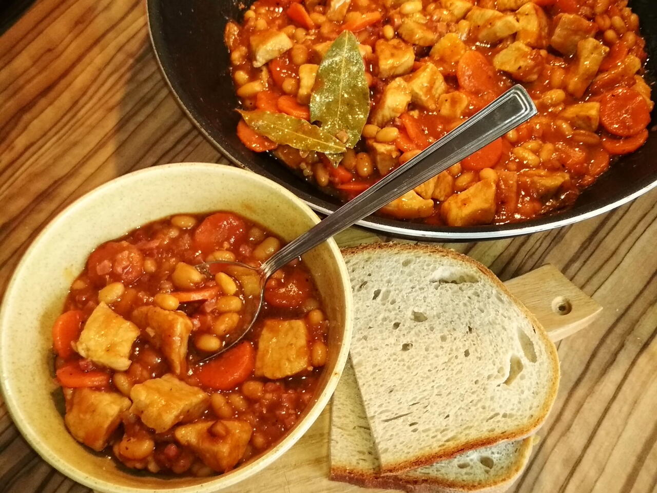 Po 20ti minutách přidáme fazole. Máme rádi pikantnější jídla tak používám chilli fazole. Podáváme s chlebem, brambory nebo hranolky.