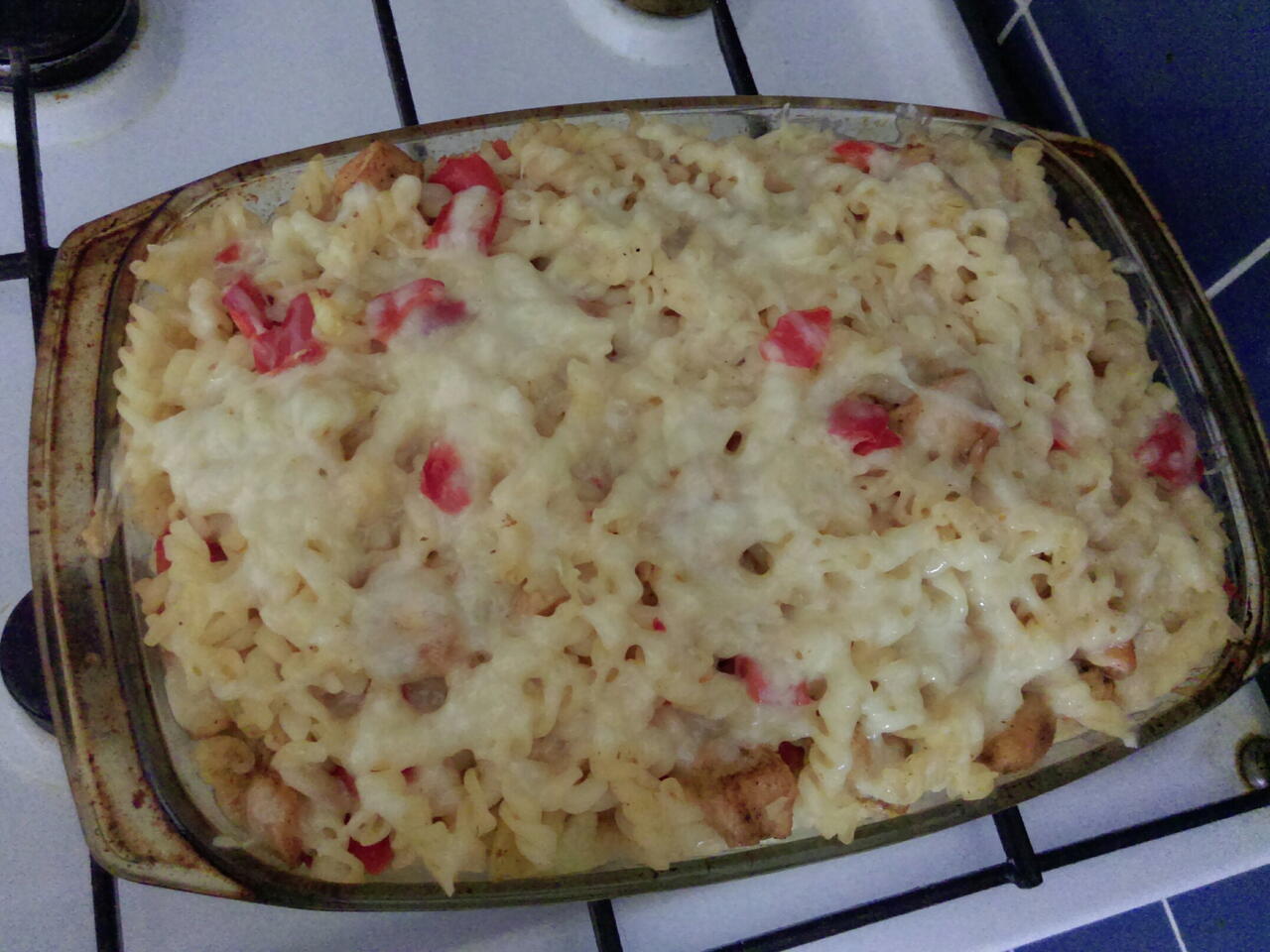 Cibuli společně s paprikami nakrájímena kostky a snažíme na oleji. Přidáme prolisovaný česnek a maso. Nakonec přidáme kukuřici a uvařené těstoviny a vše spolu smícháme.