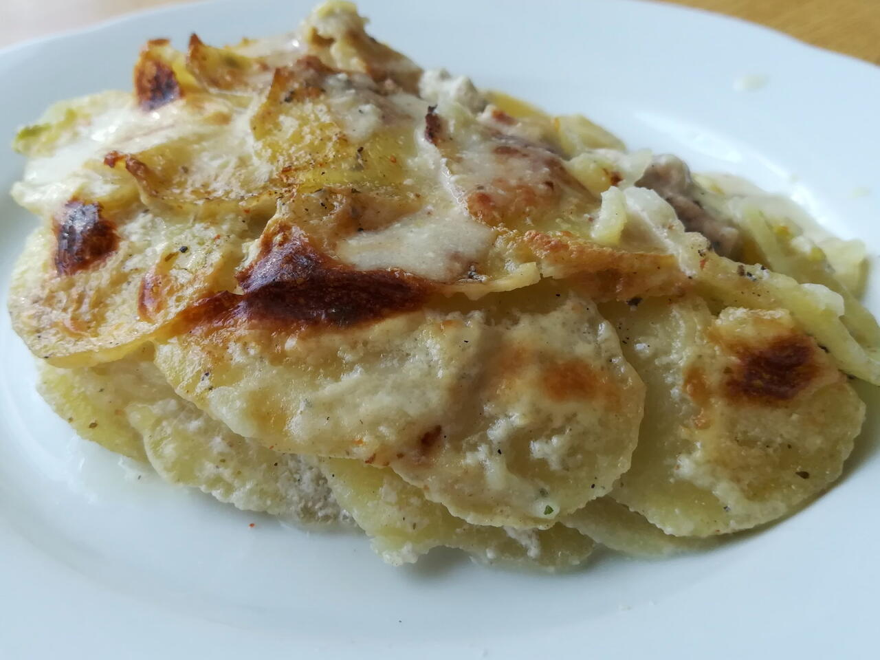 Na závěr dáme vrstvu brambor které opět lehce nasolíme a posypeme grilováním kořením. Vše zalijeme smetanou na vaření.