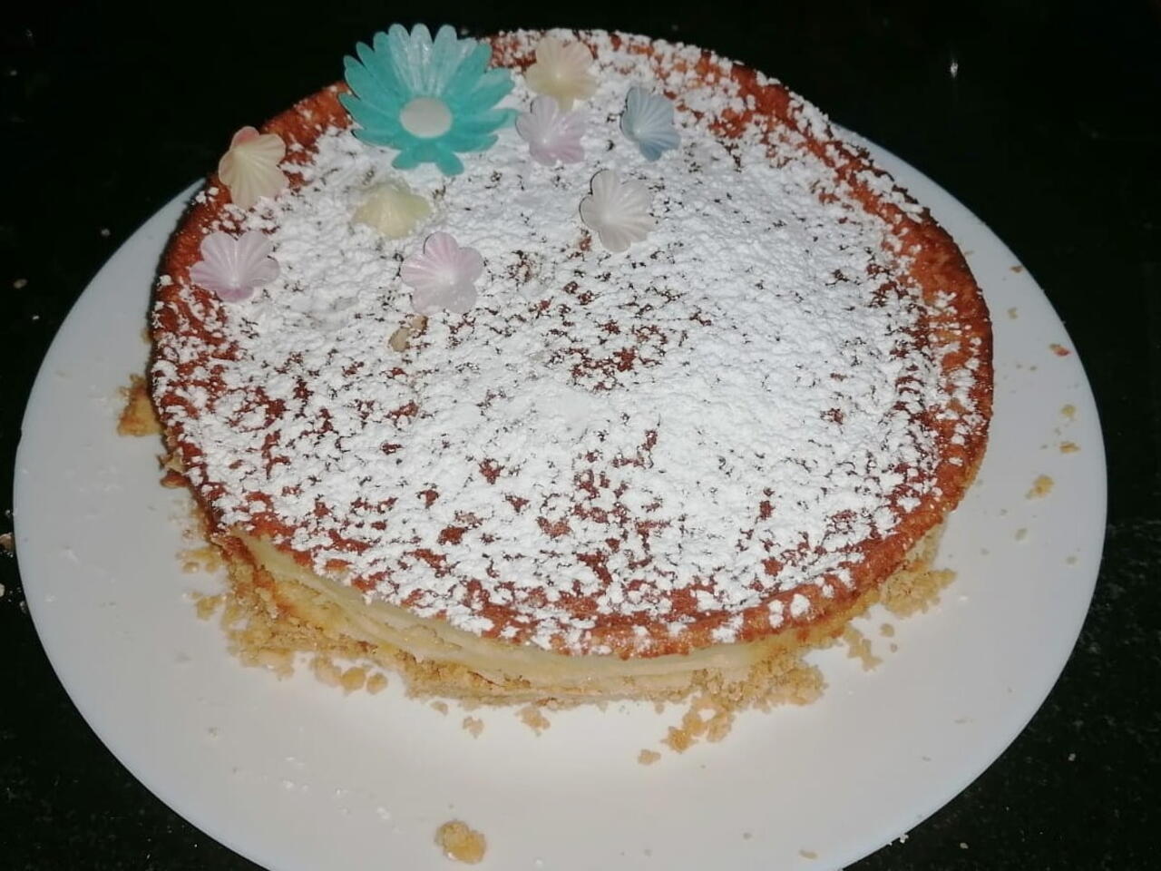 Jetzt kann er beliebig dekoriert werden zb mit Erdbeeren , Schokolade , Sahne etc.