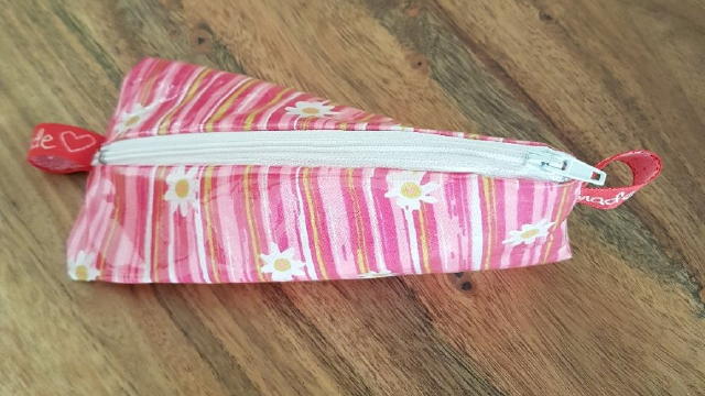 Nun den Stoff von unten nach oben zum Reisserverschluss klappen und in der Falte die zweite Schlaufe anbringen