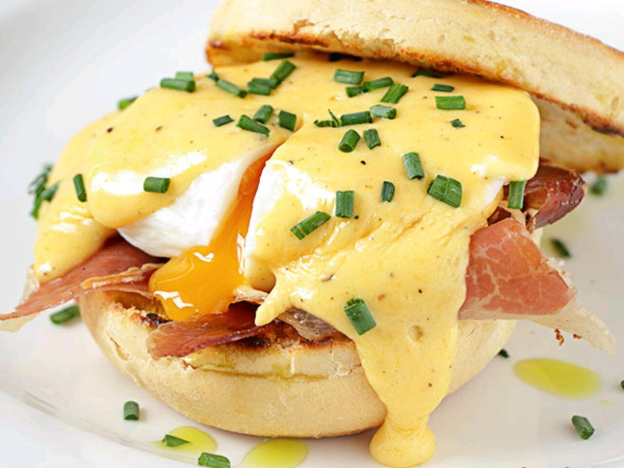 Montar pan-jamón-huevo pochado y napar con alguna salsa.