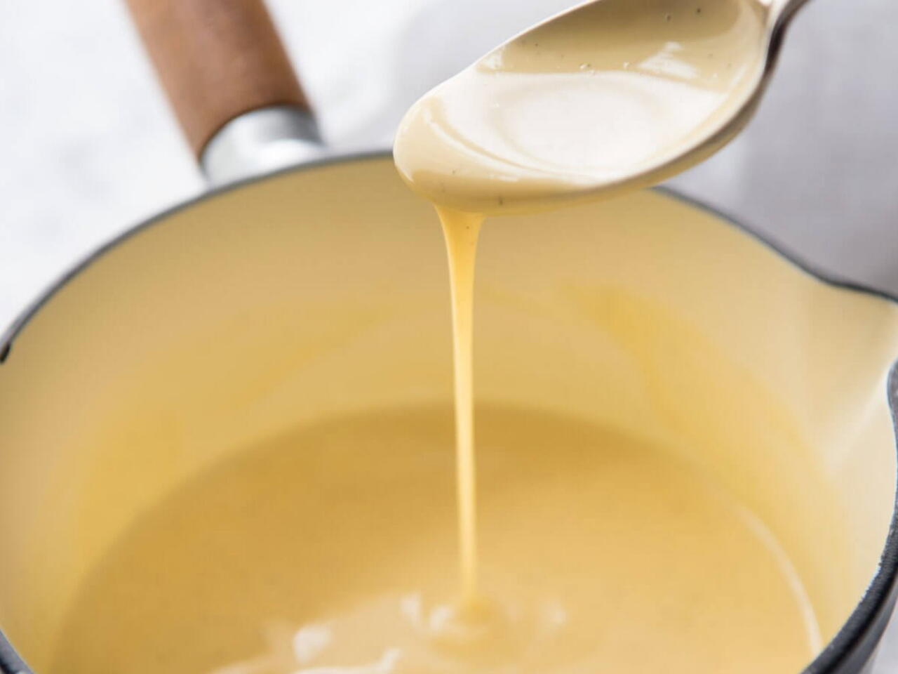 Añadir mostaza, vinagre y aceite, batiendo. Colar.