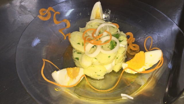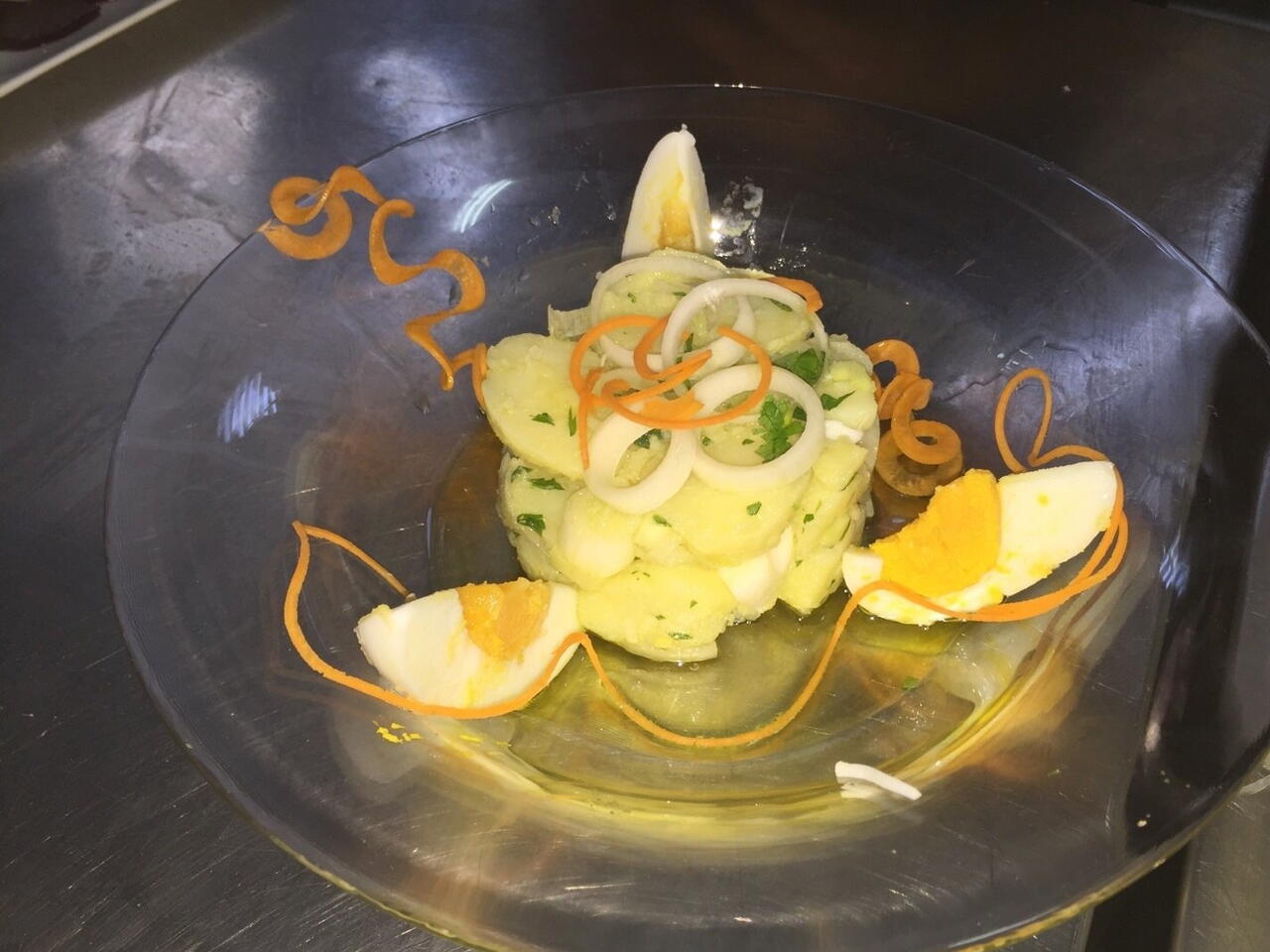 Una vez terminado con las patatas (se deja que se enfríe al natural) y seguidamente se pela y se corta en dados medianos y terminado los huevos (se pasan a un recipiente con agua fría y un poco de hielo, que se habrá preparado previamente, para parar la cocción), se pelan y se cortan en cuatro partes formando medias lunas.