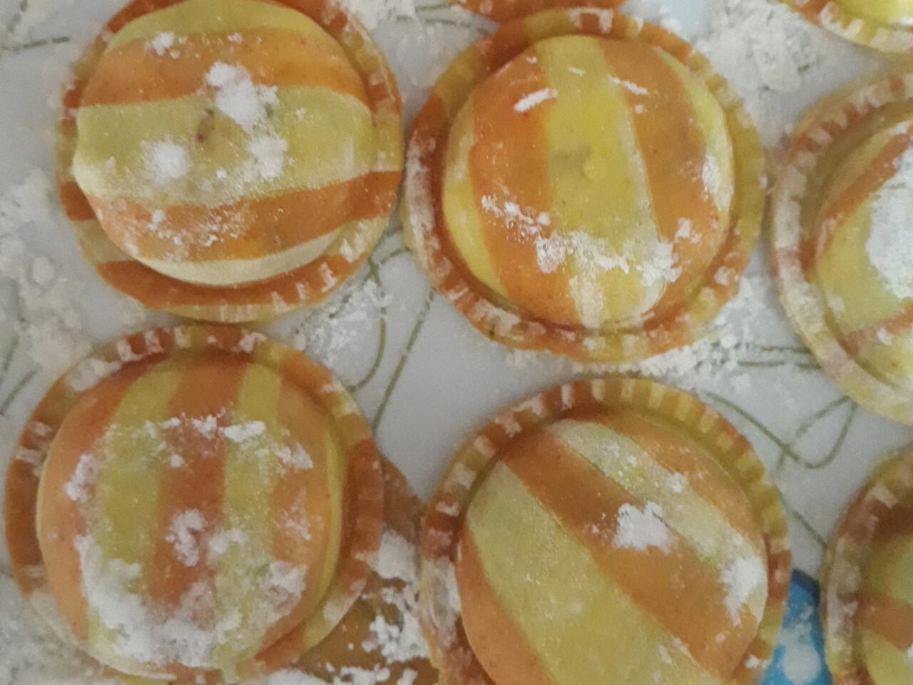 Montar las tiras de masa de pimenton sobre la masa lisa de curcuma y volver a pasar por la pastalinda.