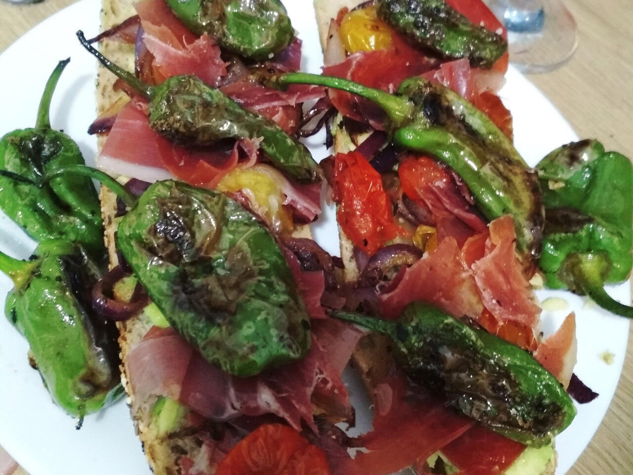 Encima del aguacate poner la cebolla roja y los tomates, encima el jamón serrano y por último los pimientos padrón