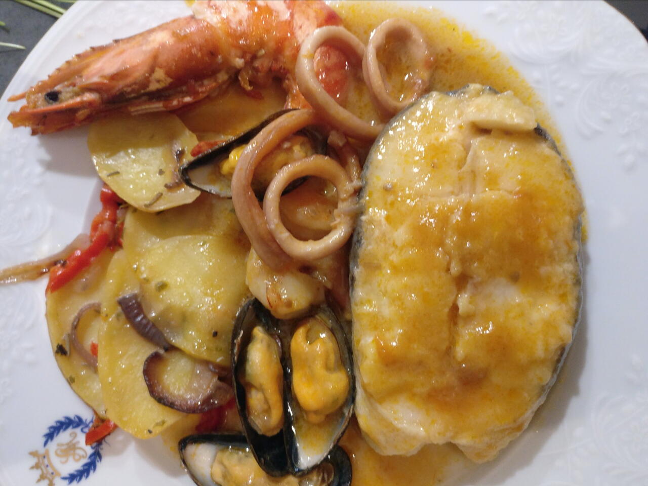 Se coloca un trozo o una pieza de pescado y gamba por comensal, moluscos y calamares y salsa. Como acompañamiento yo le puse patatas panadera