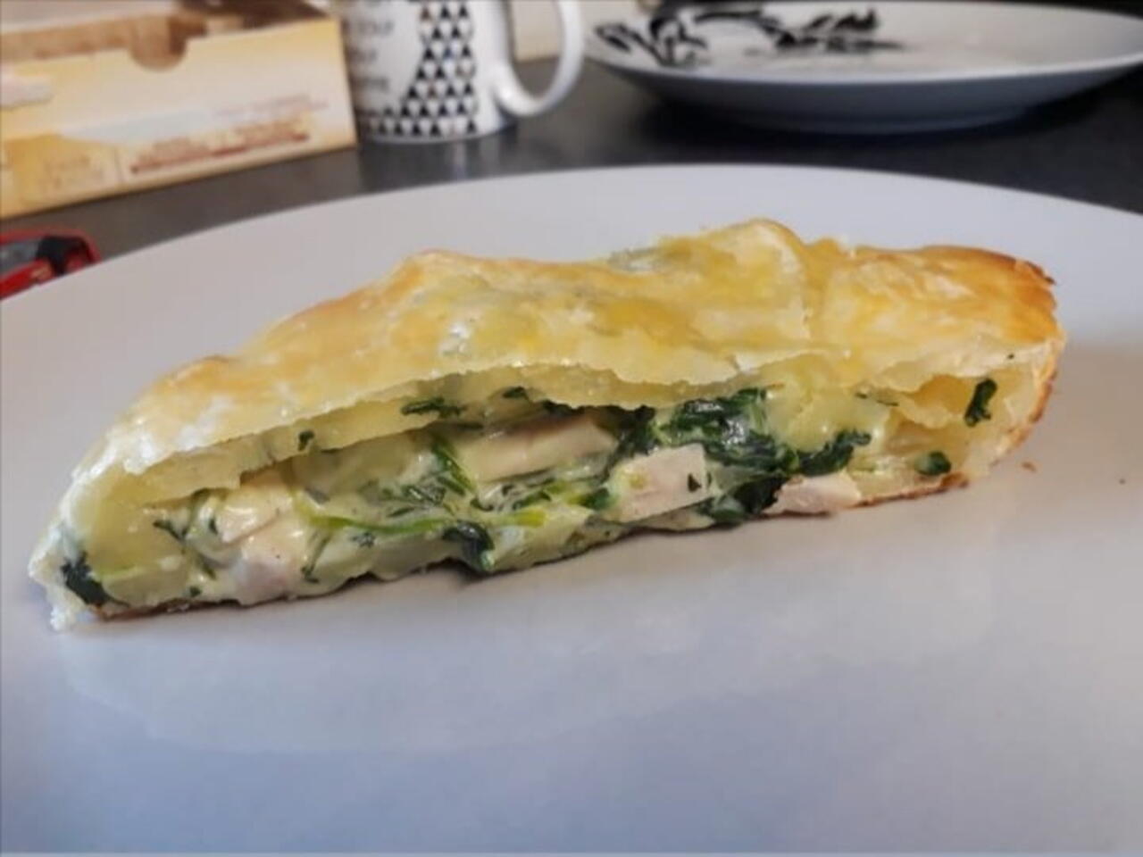Faite cuire 10-15 min les pommes de terre dans l'eau bouillante. Étaler la pâte feuilletée sur une plaque de cuisson. Mettre le poulet avec les pommes de terre, le fromage frais, les épinards, le crème et le roquefort dans une poêle. Dès que le mélange a épaissit, l'étaler sur la moitié de la pate la préparation.Refermer le chausson. Le badigeonner de jaune d'oeuf et faire quelques entailles pour ne pas que la pâte gonfle. Mettre au four à 210°C pendant une vingtaine de minutes. C'est prêt