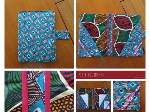 - Un tissu pour l’extérieur, un tissu pour la doublure, un bouton pression (avec sa pince pour le fixer), du biais, du thermocollant léger et lourd pour solidifier le tout, du cuir et du Crystal (pour la photo intérieur et le porte nom)