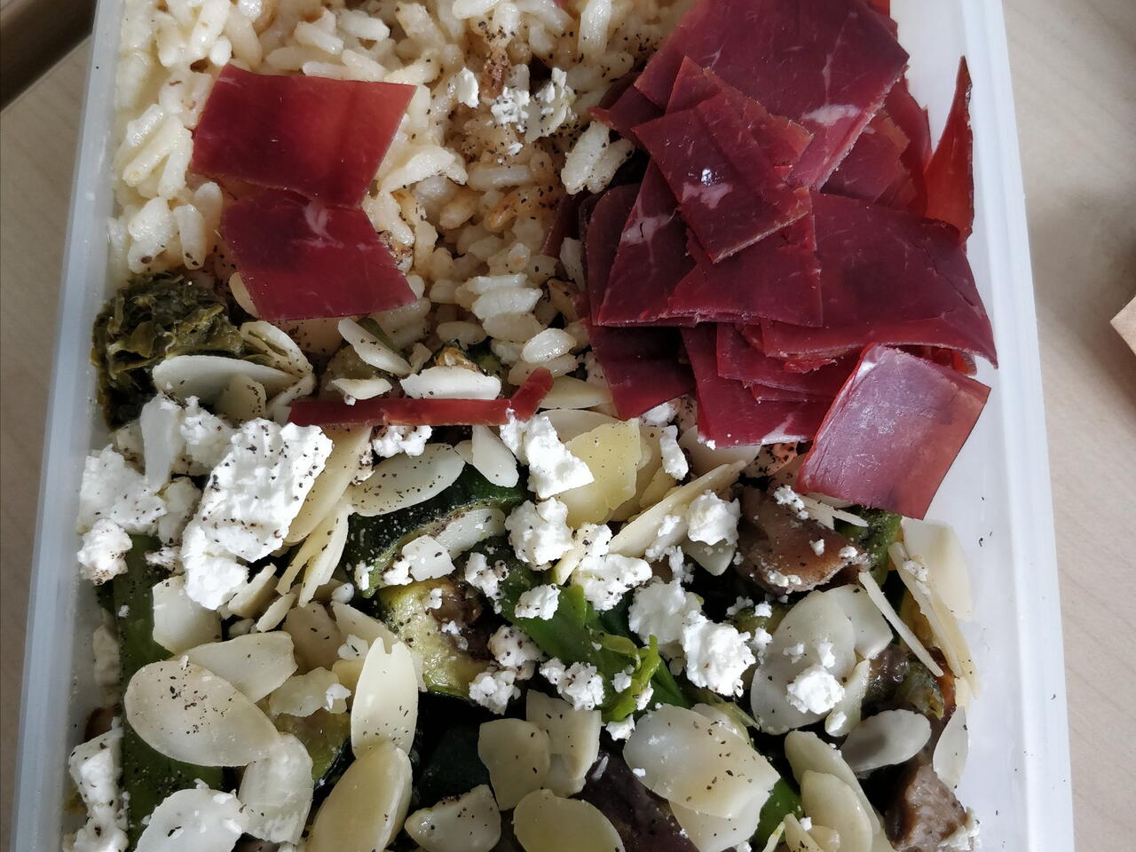 Servir le riz, recouvrir avec les légumes, mettre de la viande des grisons coupée en petit bout et disposer quelques amandes effilées et de la feta allégée