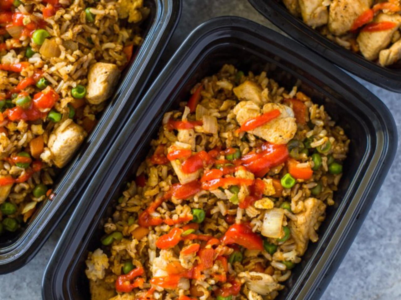 Laisser refroidir pendant 5 minutes puis diviser en 4 récipients et arroser de sriracha si désiré. Laisser refroidir le riz avant de le réfrigérer ou de le congeler. Pour réchauffer, cuire au micro-ondes à intensité moyenne-élevée pendant 2 minutes ou jusqu'à ce que la viande soit cuite à la vapeur.