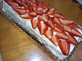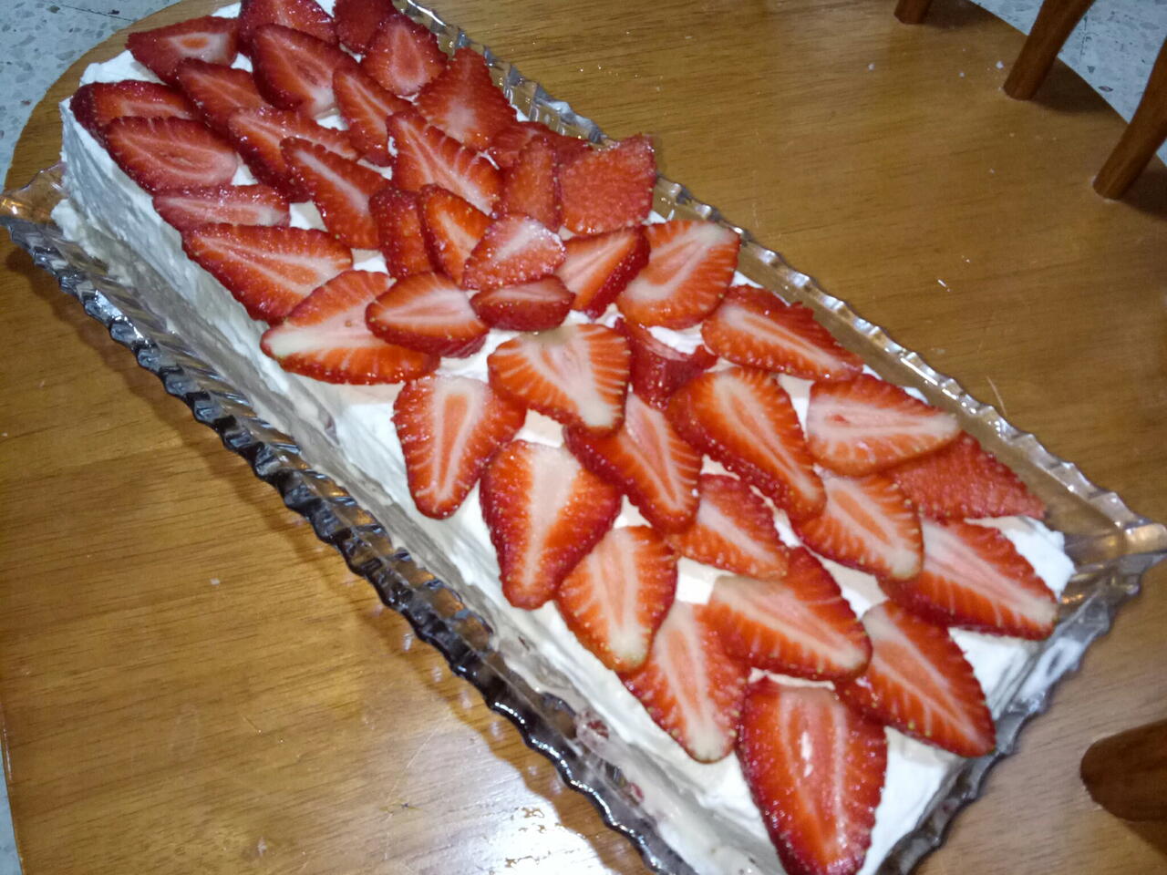 En mettrons le 1er rectangle et on le buvons avec sirop et mettre couche de creme chantie et de fraise, faire la même chose pour le 2eme rectangle.